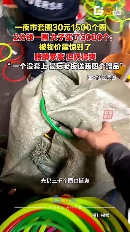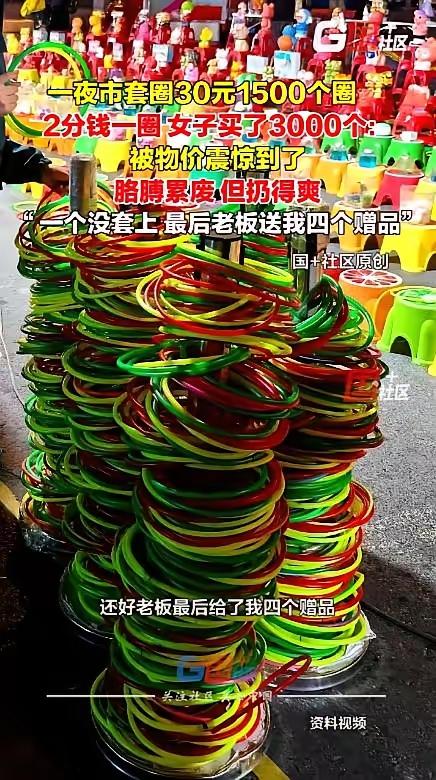 10月5日,黑龙江齐齐哈尔,一女子前来旅游时,被夜市30元1500个圈的套圈摊所震惊,于是果断买了3000个圈。 马女士费了好大一番功夫才全部扔完,可惜还是一个都没有套中! 老板觉得过意不去,就送了她4个赠品。 信息来源:国+社区 网友评论: 夏天和媳妇孩子去套了一次齐齐哈尔夜市,还30元500圈,她俩套了一只兔子,两条金鱼,三瓶饮料,一个小玩具,我零中。 有人花3000元买彩票也没有中奖……人背不要怪社会 核心机密在于奖品下面的塑料桶,孔径大于圈,富有弹性,即使你套中了也要被弹飞 有没有和我一样的昨天任务栏弹出的时候就看成30个圈15000元了 准备(目光和手)、扔、看结果,至少要三秒。 一分钟20个, 10分钟200个 75分钟1500个 我数学不好,你们帮我算算