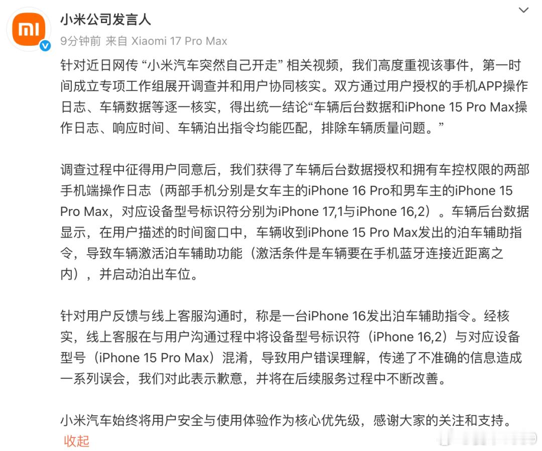 【爱车安全贴士离奇!小米汽车突然自己开走?车主当场惊叫…小米通报调查结果】一则