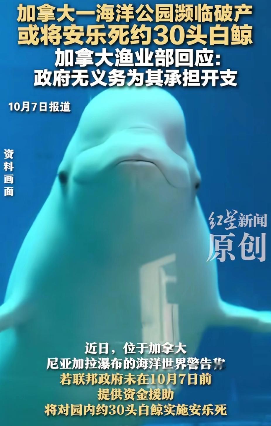 加拿大30头白鲸的命运困局,太让人揪心了! 加拿大海洋世界濒临破产,30头白鲸面临断粮危机,珠海长隆主动提出接手,却被加拿大渔业部以“可能用于表演、不人道”为由拒绝。政府既不提供资金援助,又否决放生(称人工繁育白鲸无野外生存能力),最后竟建议“安乐死”,还宣称“自由比生命重要”。 要知道,这家海洋公园自2019年已死了20头鲸类,如今白鲸每月养护费对其是天文数字。一边是能提供专业照料的新归宿,一边是用“人道”当遮羞布的不作为,难道让白鲸活下去,不比空谈自由更实在?希望这场僵局能有转机,别让这些生命成了政策博弈的牺牲品。 加拿大白鲸困境