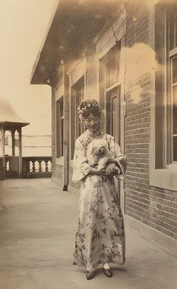 照片中,婉容身着素雅旗装,正以小臂温柔环抱着一只毛色柔亮的宠物狗 —— 这类犬只正是清宫盛行的 “宫廷狮子狗”(京巴旧称),属太监信修明在《老太监的回忆》中记载的 “龙狗” 品类,或为长毛 “狮子” 型。 此照大概率摄于 1924 年前后的紫禁城,常见于储秀宫院内或御花园等场景,彼时婉容入宫不久,与溥仪的婚姻早已显露疏离 —— 大婚之夜溥仪便独居养心殿,深宫生活的单调孤寂让宠物狗成为她最重要的情感寄托。她的爱犬享有远超平民的待遇:有专人照料起居,口粮包括大米饭、牛肉、猪肝等,这与《清宫述闻》中 “紫禁城里豢犬数百,皇族犬只饮食精贵” 的记载互为印证。 溥仪同样痴迷养犬,曾搜罗中外名犬逾百只,赐名 “紫球”“蓬头”“泰格” 等,其中不乏从英国购入的大型虎形犬,而婉容更偏爱小巧的京巴,常带它们在庭院逗弄、合影,甚至将其作为照相必备衬景。
