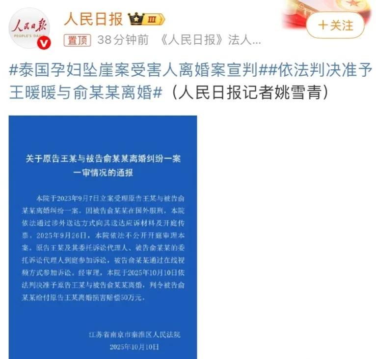 泰国孕妇坠崖案受害人离婚案宣判:离婚成功,王暖暖前夫被判赔50万。 2019年6月9日,王暖暖在泰国被丈夫俞某冬推下34米高的悬崖,全身17处骨折,在ICU抢救8天才脱离生命危险。经过泰国法院三次审理,俞某冬最终被判处有期徒刑33年零4个月。2023年9月6日,王暖暖委托律师向南京市秦淮区人民法院递交离婚起诉状,要求与俞某冬离婚,并要求其净身出户。次日,法院正式立案。由于被告俞某冬在泰国服刑,这起案件成为中国首例被告在境外服刑的离婚案。 离婚,对于王暖暖来说,无疑是一场艰苦的战斗。 王暖暖在这场婚姻中不仅遭受着情感上的折磨,还面临着生命威胁。她在悬崖边与死神擦肩而过,那种绝望和恐惧,是我们常人难以想象的。 经历了无数个日夜的煎熬,但她始终没有放弃,一直努力为自己争取应有的权益。经审理,2025年10月10日法院依法判决准予原告王某与被告俞某某离婚,判令被告俞某某给付原告王某离婚损害赔偿50万元。据悉,王暖暖已经拿到了判决书,“她终于完成了一件很重要的事情”。 这场离婚的意义早已超越个人解脱。它不仅破冰了国内首例跨国服刑离婚案的司法困局,更以50万元损害赔偿的判决,彰显了法律对受害方的保护——深渊之下,总有重生的微光。法治之外,更有人情。 在经历了那么多磨难之后,王暖暖终于如愿以偿,成功离婚,也等来了她期盼已久的自由。赔50万不能为人生买单,只是王女士走向新生的开始,没有先例,真的就让这成为先例!