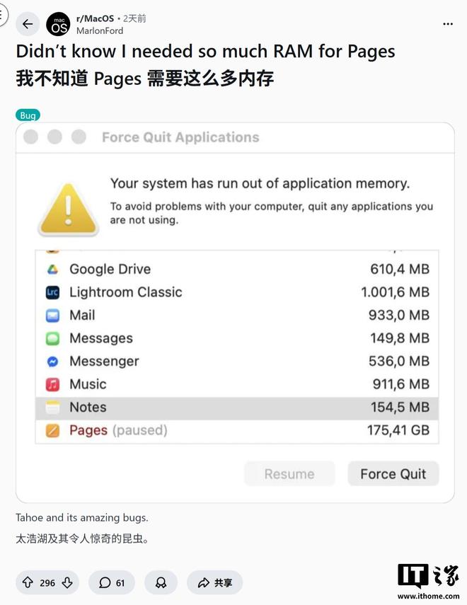 另一张截图则更为夸张,Pages文稿应用在系统发出内存耗尽的警报前,占用量一度飙升至175.41GB,远超硬件物理上限。IT之家附上截图如下: