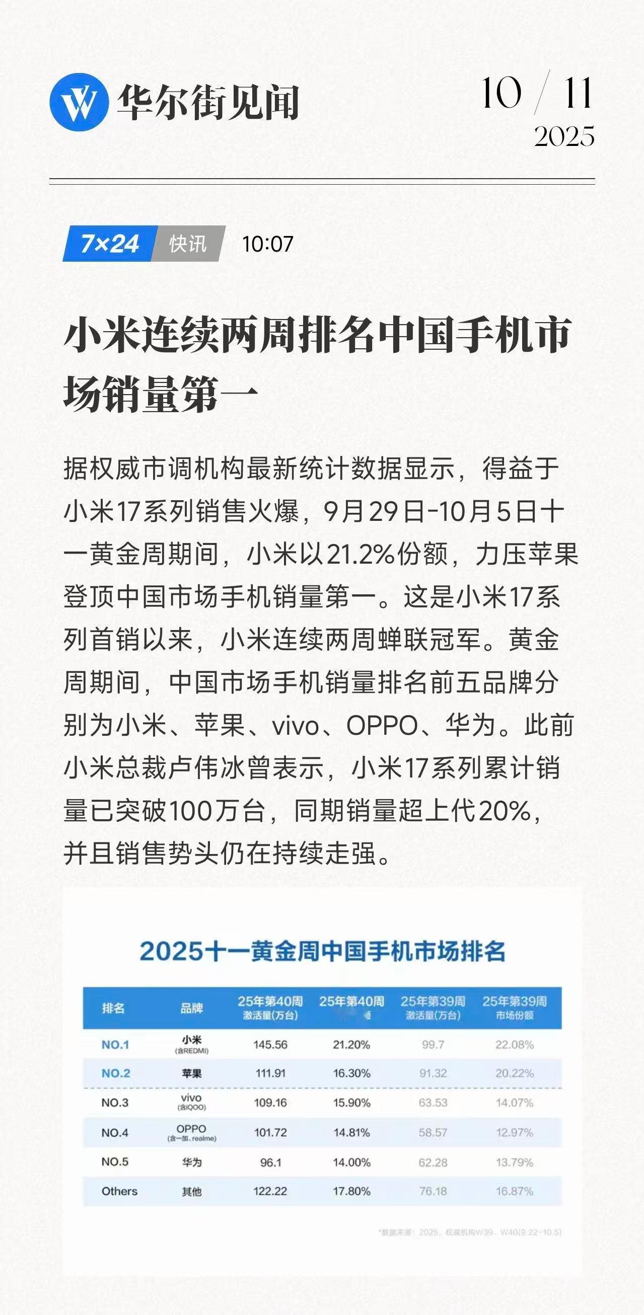 据第三方调研机构数据显示,得益于小米17系列销售火爆,9月29日-10月5日十一黄金周期间,小米以21.2%份额,成功力压苹果登顶中国市场手机销量第一。这是继小米17系列首销后,小米连续两周蝉联冠军。黄金周期间中国市场手机销量排名前五品牌分别为小米、苹果、vivo、OPPO、华为。此前小米总裁卢伟冰曾表示:小米17系列累计销量已突破100万台,同期销量超上代20%,并且销售势头仍在持续走强。