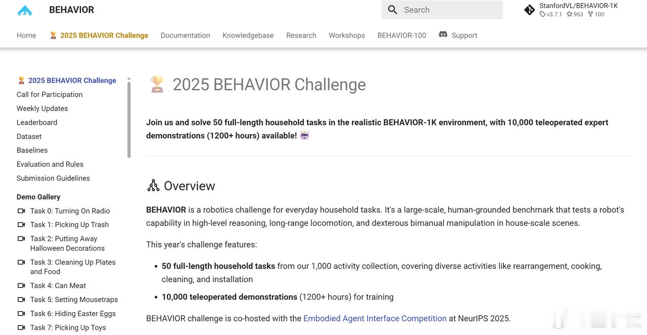 她发起了一个新挑战赛——BEHAVIOR家务挑战赛,由斯坦福牵头、英伟达赞助,目标是用ImageNet当年的办法,把机器人做家务这件事标准化、规模化、系统化地搞起来。
