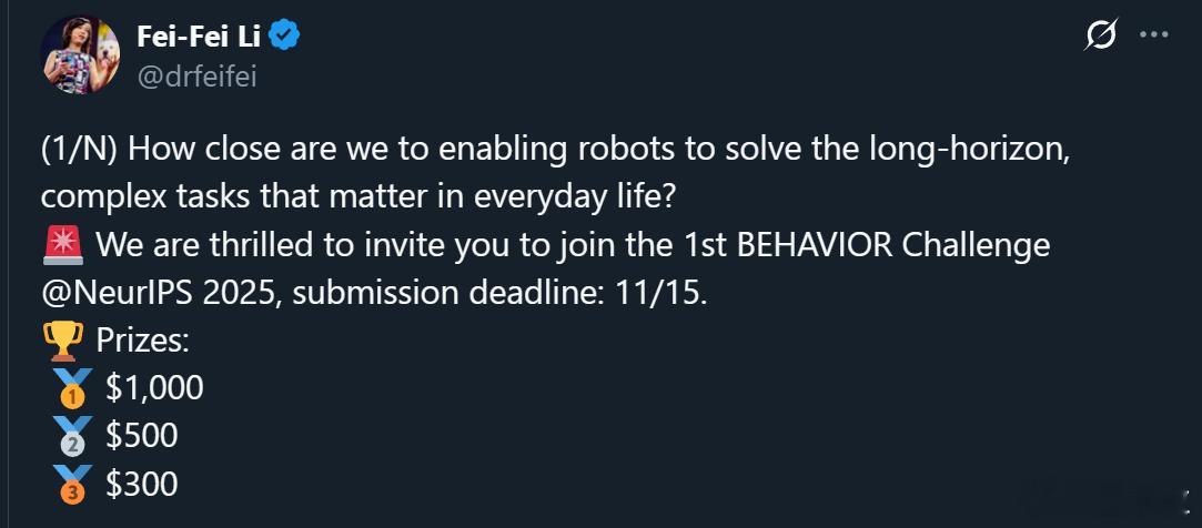 现在机器人领域的最大问题就是碎、不标准、缺数据——和ImageNet诞生前的计算机视觉领域如出一辙。她希望通过这个挑战赛,为机器人研究确立“北极星”任务,把全行业的研究推到一个方向上。
