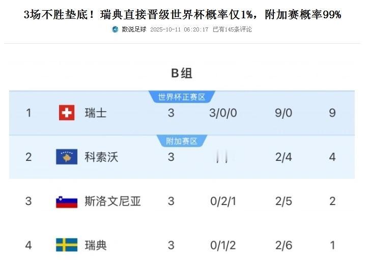 瑞典确实不行,小组垫底。 他们拥有哲凯赖什和伊萨克,阿森纳和利物浦的大宝贝前锋,居然都进不了球。 瑞士排名世界第17,在这个小组无敌了。 瑞典排在第32,明明比科索沃,斯洛文尼亚都要高,小组第二没拿到就是失败。[黑线]