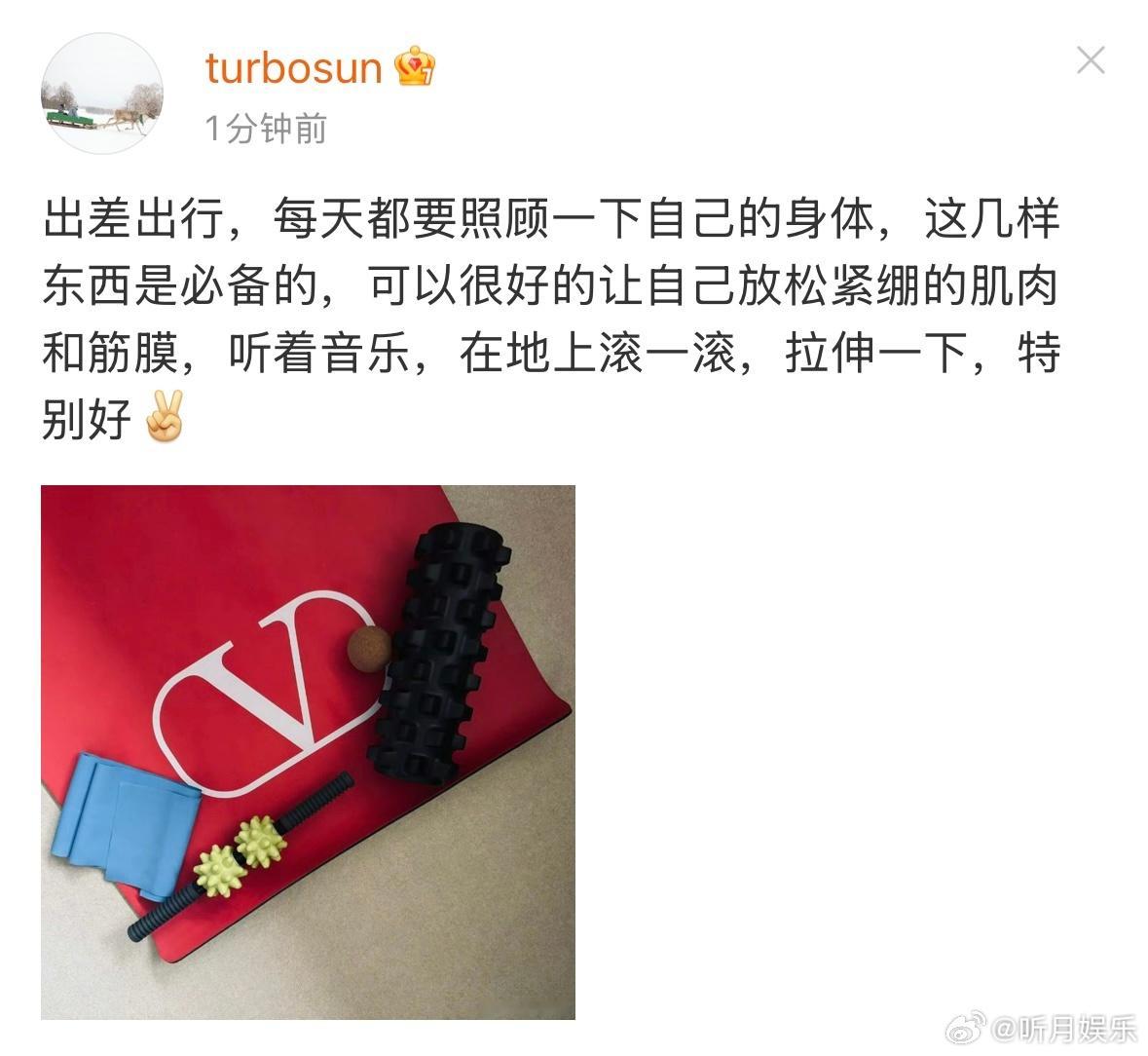 孙俪说每天都要照顾一下自己的身体 孙俪发文:出差出行,每天都要照顾一下自己的身体,这几样东西是必备的,可以很好的让自己放松紧绷的肌肉和筋膜,听着音乐,在地上滚一滚,拉伸一下,特别好[耶] 孙俪每天都要照顾一下自己的身体
