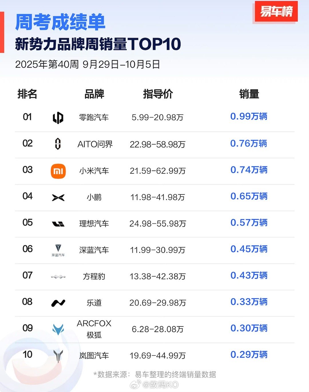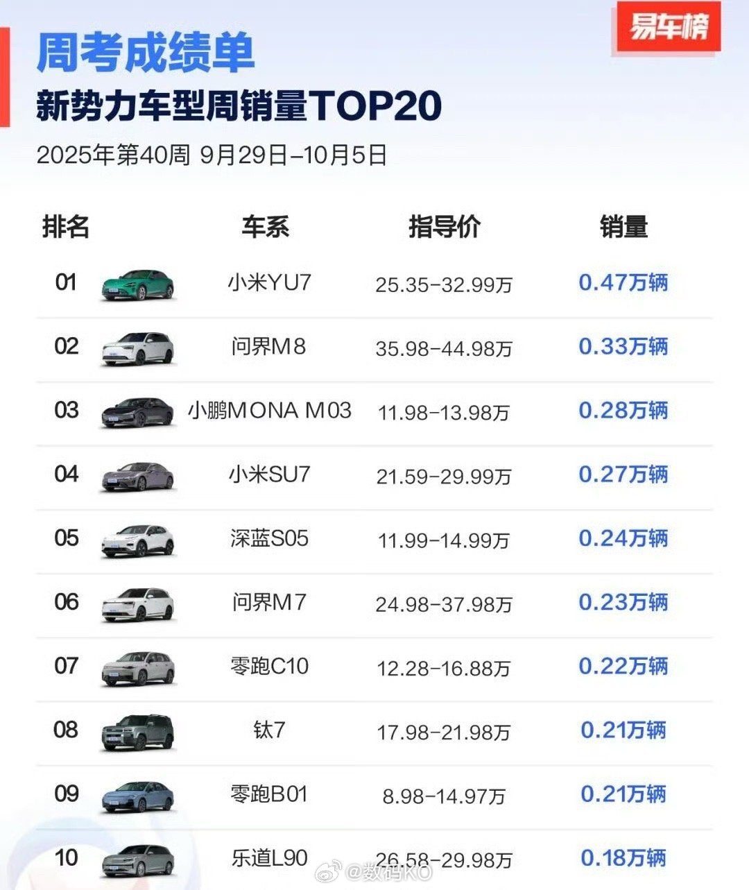 新势力上周各家销量,单车型,小米YU7和su7都挺能打。