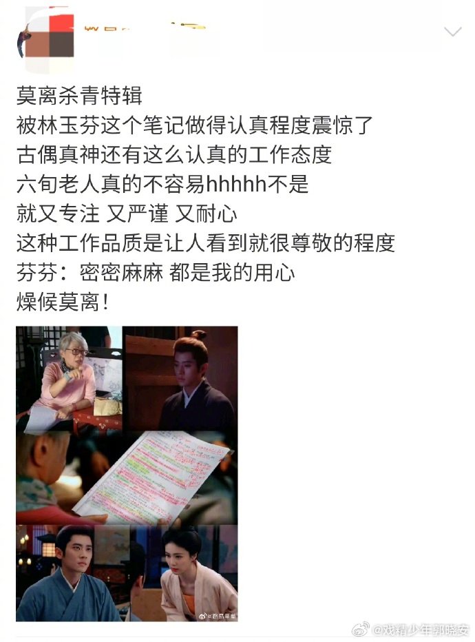 看到林导剧本上密密麻麻的笔记就有被狠狠震惊到,这种认真的工作态度是真的会让我们观众肃然起敬!感觉林玉芬真的很会教人演戏,特辑里看导演分析人物性格的那个透彻,就知道林导专业这方面没得说!有这么严谨的导演在,我会燥候莫离 这对救赎感cp!