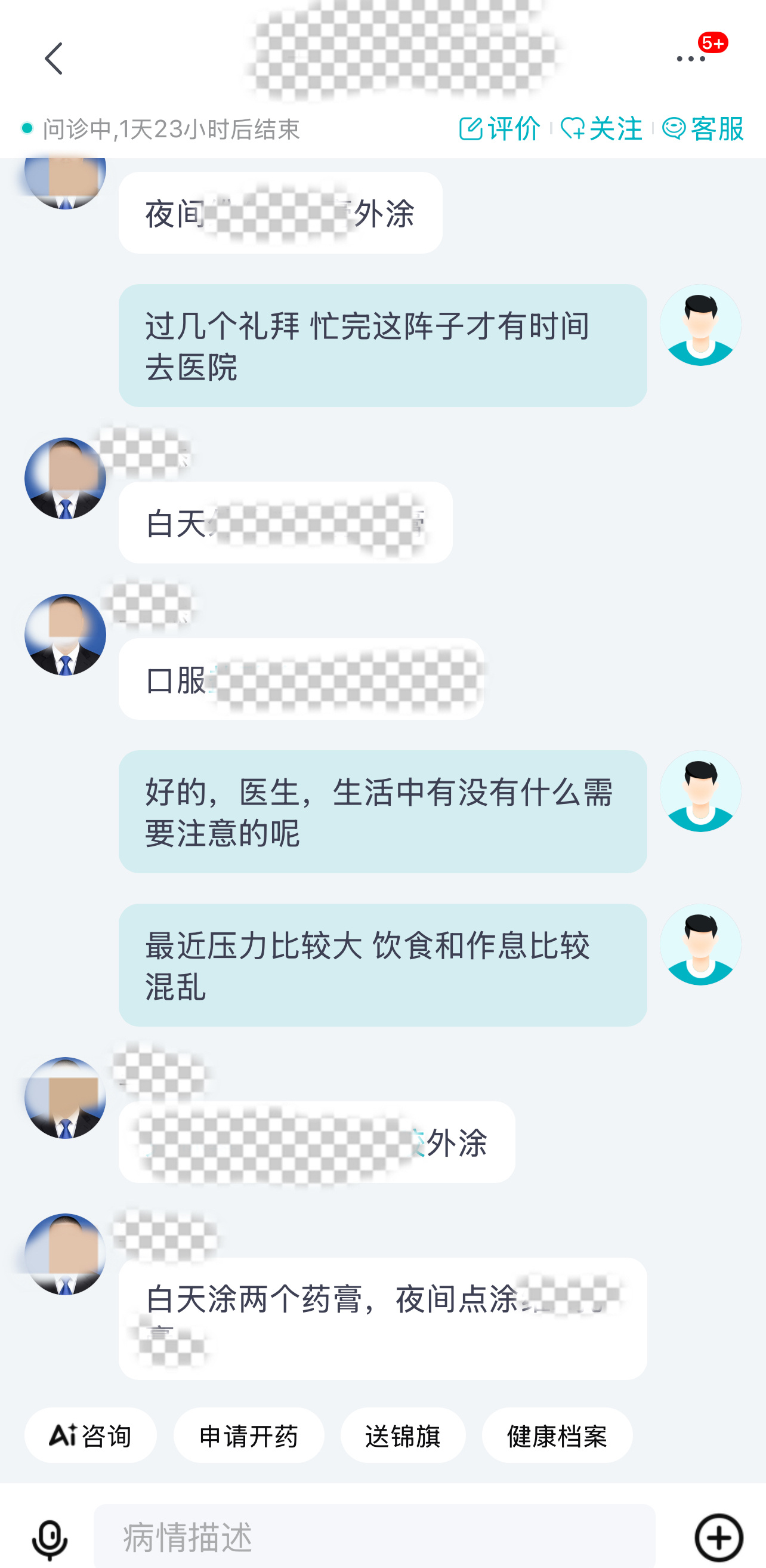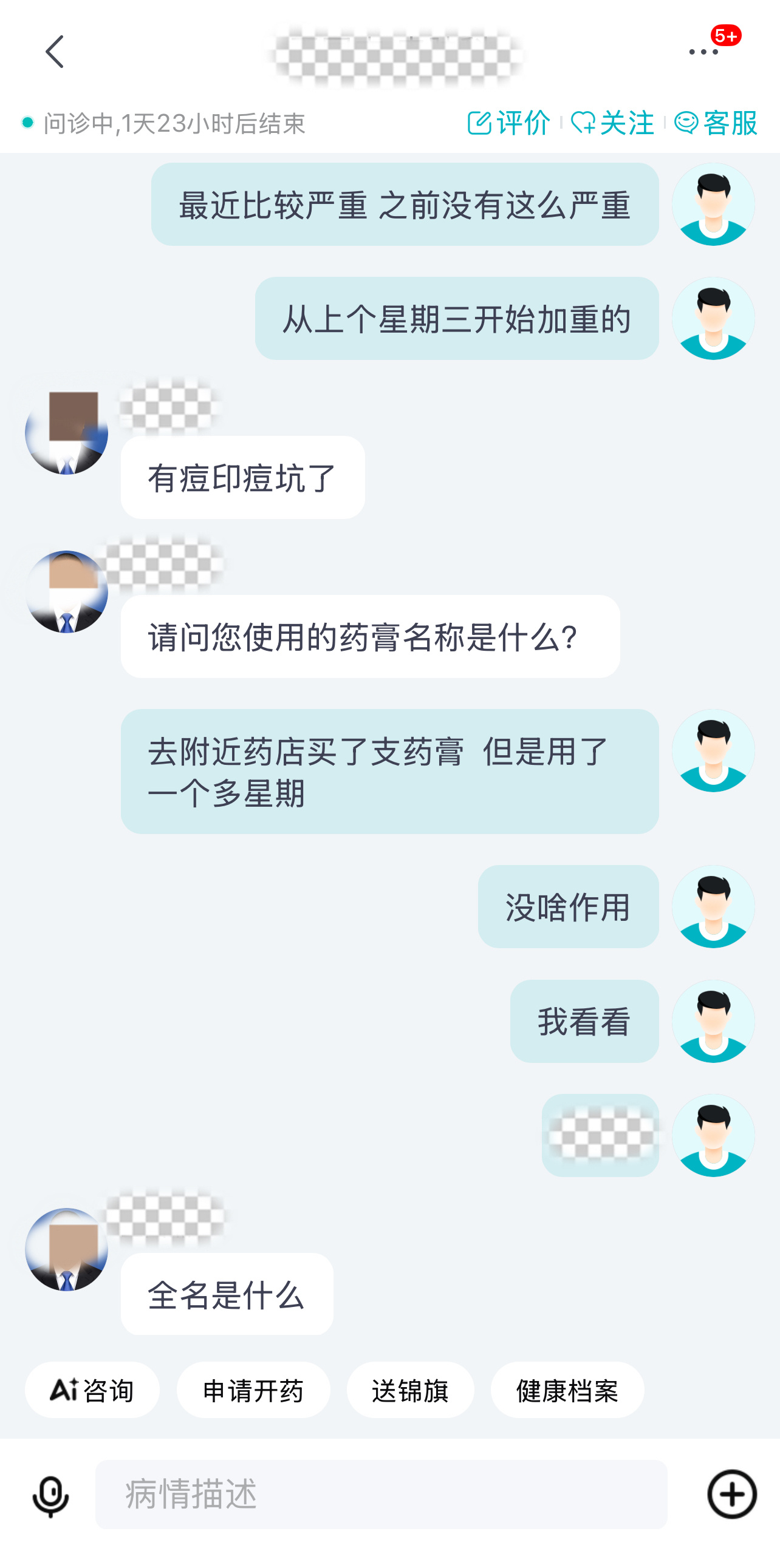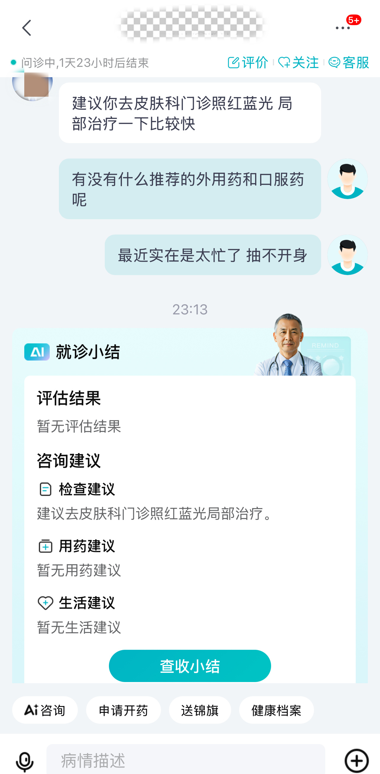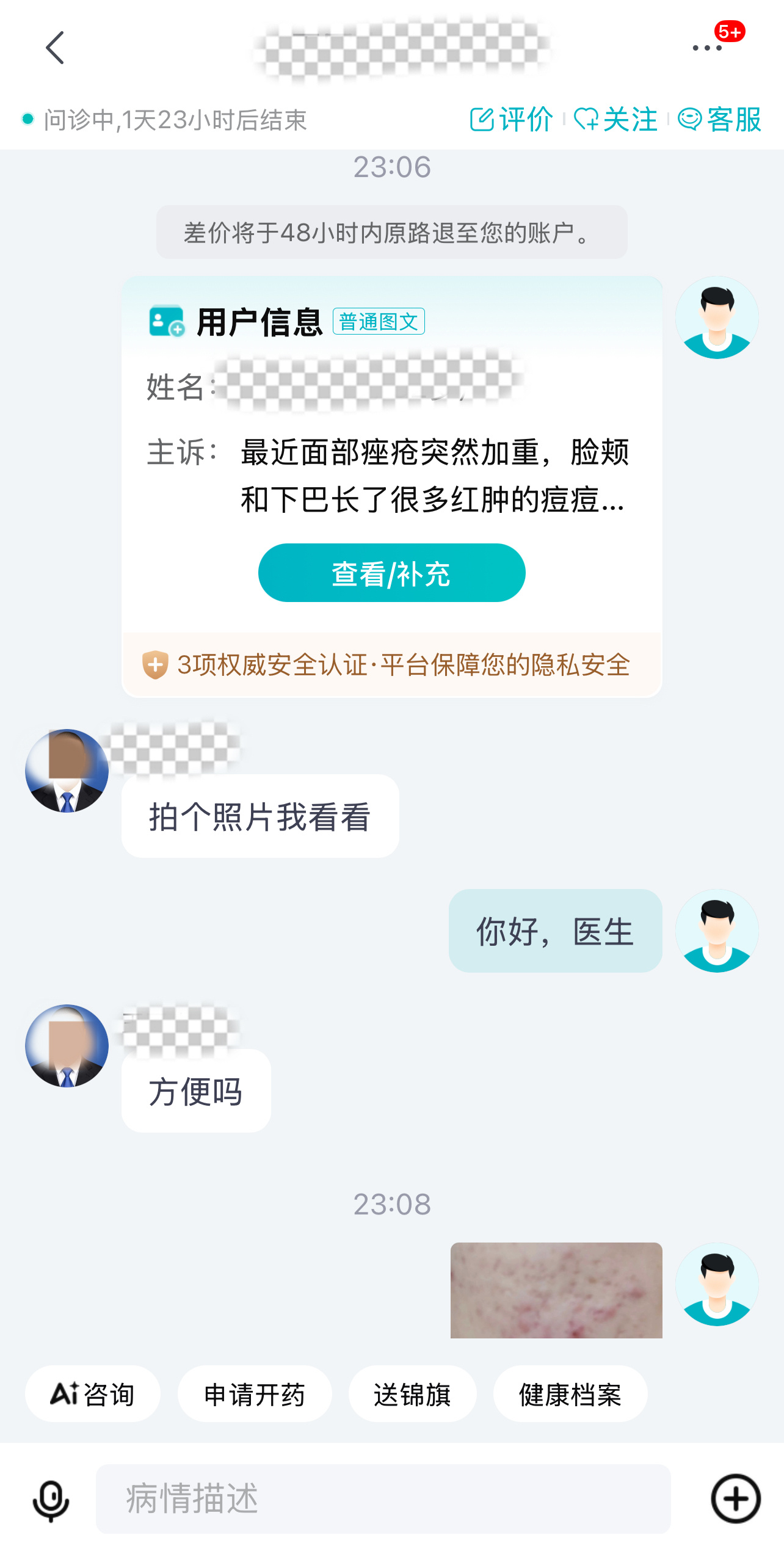 我抱着试试的心态打开京东,搜 “皮肤医院” 就直接进入了问诊页面。在 AI 问诊入口输入 “熬夜爆痘、痤疮加重”,不到一分钟就有医生接诊。我把脸部痘痘的照片拍过去,还详细说了最近用的药膏和经常熬夜、吃外卖的情况。
