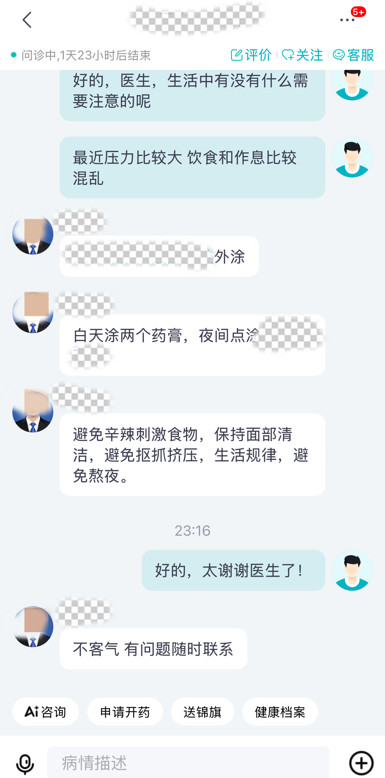 医生特别耐心分析了突然爆痘的原因,还说我现在使用的药膏已经不能满足现在的状态了。在明确我需要快速恢复皮肤状态需求后,医生建议我去皮肤科门诊照红蓝光,局部治疗下会更快,同时开了药膏外涂和内服药,并且叮嘱我用药建议和日常饮食作息。