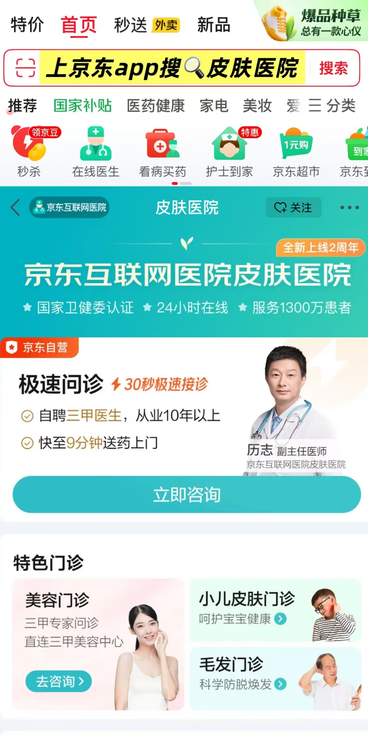 正愁着没时间跑医院,群里立马有人冒出来说:“别乱买药膏了!我之前和你一样自救,药店买了药膏涂没啥用,后来尝试了线上问诊,按照医生建议买药用了后很快见效了,比自己瞎折腾靠谱多了。而且流程也简单,直接在京东app搜皮肤医院,赶紧让医生看看再买药。”