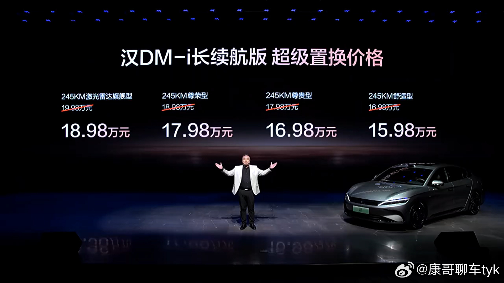 比亚迪汉长续航版15.98万起上市比亚迪汉DM-i 245KM版置换后15.98万起,汉EV版15.98万起