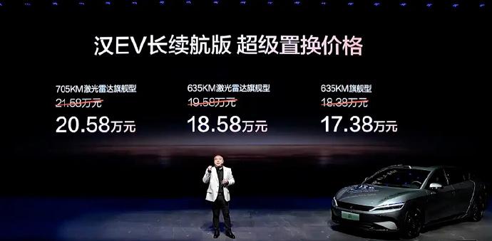 我一直都觉得,中国新能源汽车真正的“开山之作”,是比亚迪汉! 正是从这款车开始,比亚迪新能源车型开始一发而不可收,国产新能源也开始真正为消费者所接受。 这款车上市5年,均价20万,累计销量过百万,而且,它还在不断进化。 刚刚,汉DM-i 245KM长续航版超级置换补贴后售价15.98万-18.98万元;汉 EV长续航版超级置换补贴后售价15.98万-20.58万元(10月31日前完成购车可享10000元置换补贴)。 新车最直接的变化主要有两点: 第一,续航提升,汉DM-i 245km长续航版纯电续航里程提升至245km,汉EV 635/750km长续航版续航里程最大可达705km; 第二,用车成本降低,DM-i车型亏电油耗仅为3.44L/100km,EV车型百公里电耗低至10.6kWh; 这两大变化,都是直面消费者痛点,DM-i车型在城市里也可以当做纯电车型来使用,EV车型则能实现冲一次电用一周。 除此之外,新车还对部分细节进行了调整,例如它取消了传统的档把机构,改为消费者呼声比较高的电子怀挡机构,整个内饰更加简洁大气。 同时,还增加了车载冰箱,同时车内储物空间也有所增加。 看来,比亚迪在全球新能源汽车销量冠军的位置上坐了4年,但依然在倾听用户声音。 新车上市后,同级别曾经的霸主如德系燃油车们又要“压力山大”了。比亚迪汉长续航版15.98万起上市