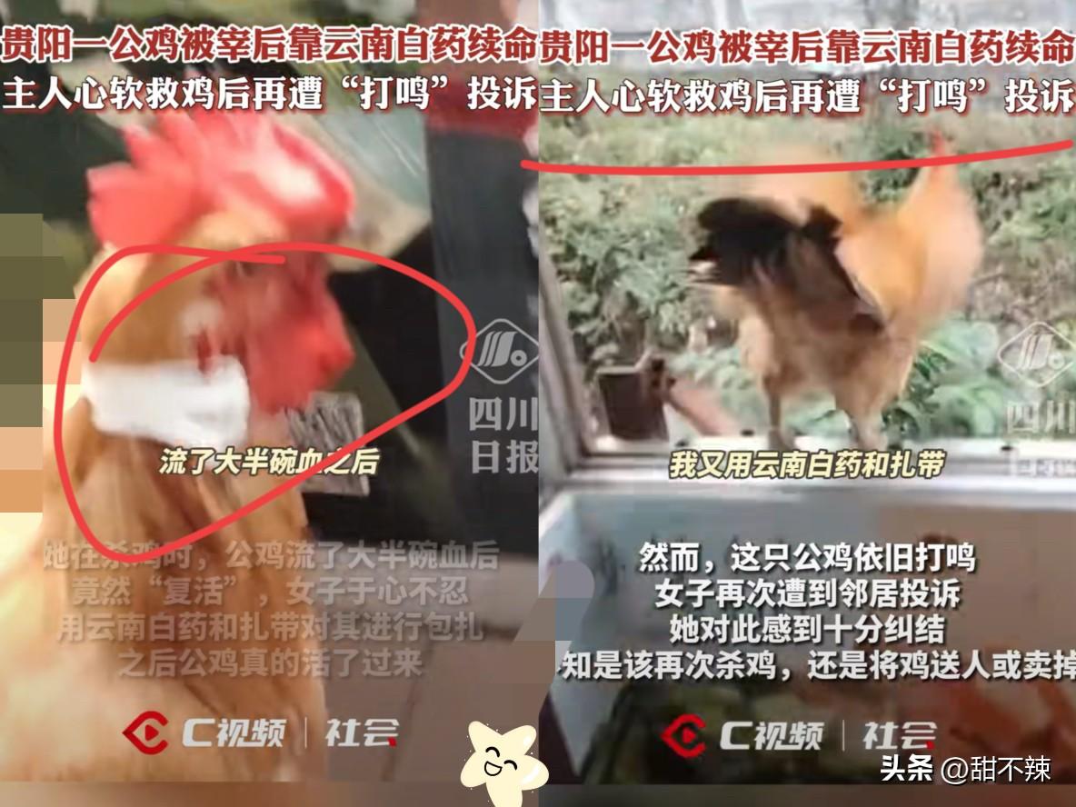 “不可思议”。贵州,一只大公鸡频繁夜里乱打鸣,遭邻居多次投诉,无奈主人只好计划给它炖了,结果水刚烧开,那只公鸡竟活了。 贵州李女士家的公鸡,因为总在半夜12点、凌晨2点扯着嗓子打鸣,邻居投诉不停! 李女士本来就舍不得,这鸡是自家母鸡孵的,养了好久有感情! 见它这么能扛,赶紧用药物和扎带帮它包扎脖子,没几天这鸡就又蹦又跳! 可坏毛病一点没改,照样半夜“开嗓”,邻居又来吐槽,李女士现在愁得睡不着觉! 网友都说这鸡有灵性,“大难不死必有后福”,其实不管是家禽还是啥,这种拼了命要活着的劲儿,真的特别打动人! 咱们常说尊重生命,这只公鸡不就是最好的例子嘛,哪怕只是只鸡,它的生命力也足够让人佩服! 你们觉得呢?欢迎评论区讨论!