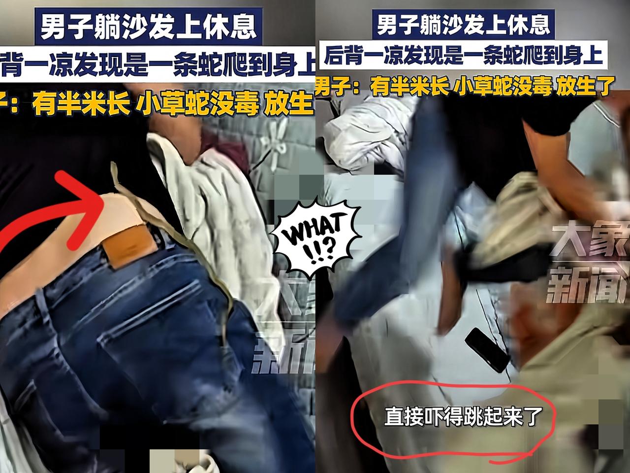 万万没想到! 福建漳州一男子上了一天班很是疲惫, 回家躺在沙发上睡着了,睡梦中他感觉 后背发凉,以为家里漏水,伸手一摸,摸到个冰冰凉凉还乱动的东西,一下子就被吓醒了! 睁眼一看,居然有条蛇正爬在自己身上呢!男子本能一哆嗦,把蛇甩到一边,直接从沙发上跳起来! 好在这蛇虽有半米长,但只是条细小温顺、无毒的草蛇。男子用木棍把蛇抓进瓶子,去附近河边放生了! 网友们议论纷纷,有人说男子那一跳看得出是真被吓到,要是毒蛇可就糟了;还有人调侃草蛇可能是母的才没咬人! 不过话说回来,睡梦中有奇怪东西爬上身,确实能把人吓得够呛,估计好几天都有心理阴影。 你们觉得呢?