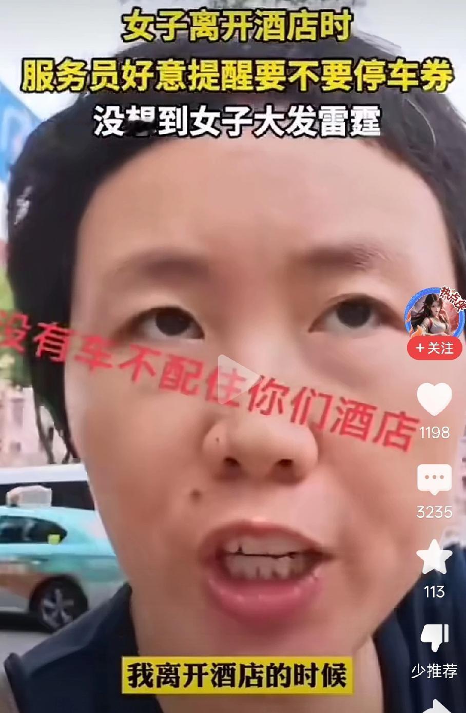 这个差点把我笑崩了[捂脸][捂脸] 女子入住酒店,酒店没给停车卷!女子出酒店的