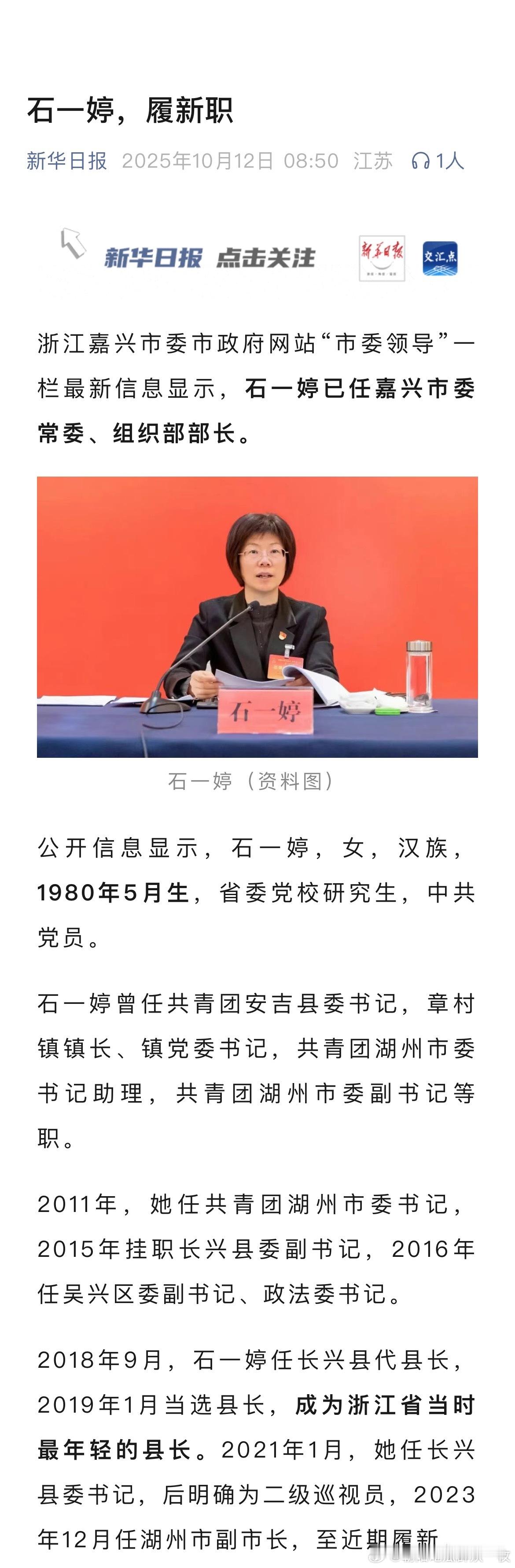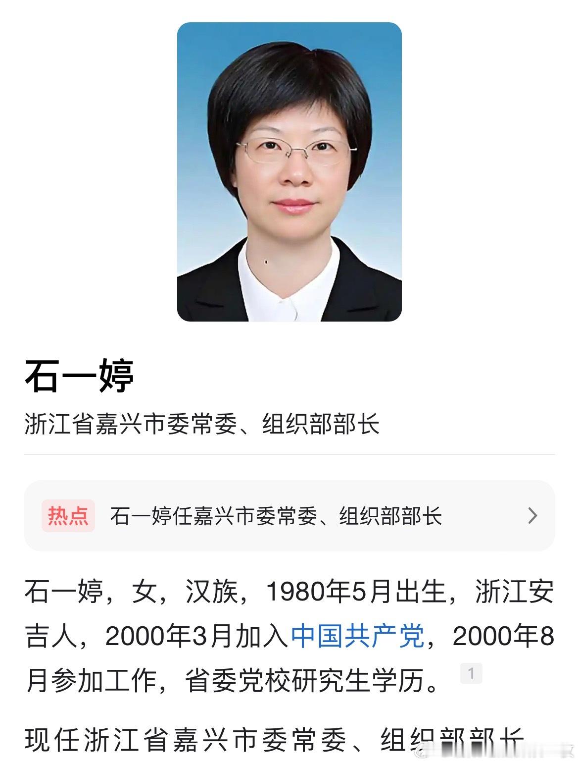 浙江嘉兴市委市政府网站“市委领导”一栏最新信息显示,石一婷已任嘉兴市委常委、组织部部长。