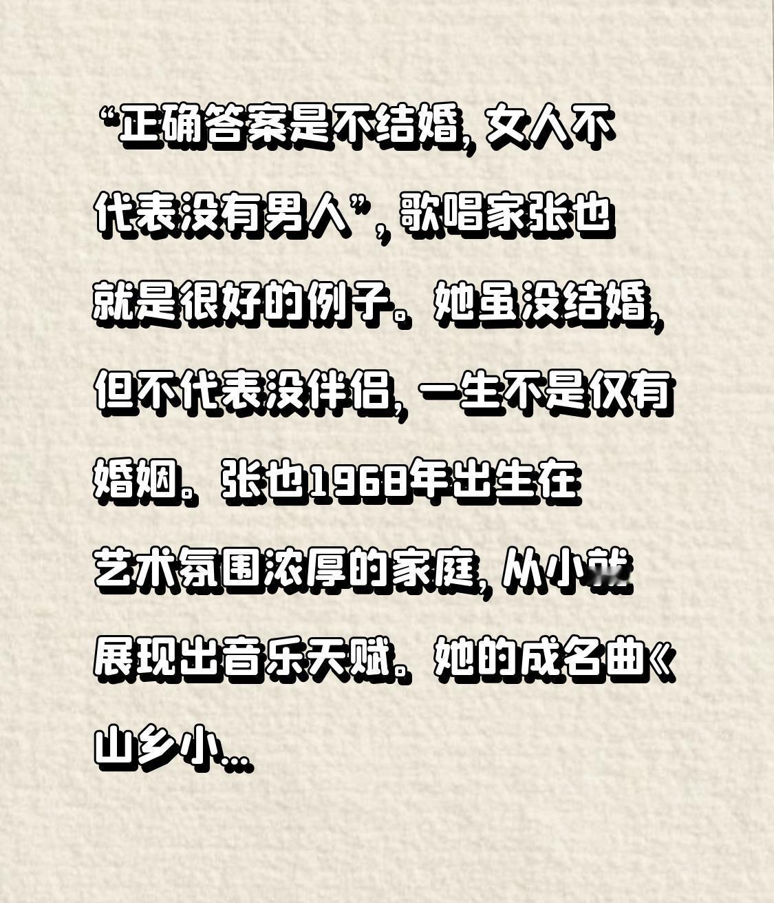 正确答案是,女人不结婚,不意味着身边没有男人;而男人不结婚,大多情况下身边确实没有女人。歌唱家张也便是很好的例证。她虽未步入婚姻殿堂,但这并不代表她没有伴侣,人生并非只有婚姻这一种模样。 张也于1968年出生在艺术氛围浓郁的家庭,自幼便展露音乐天赋。她的成名曲《山乡小渡船》让金铁霖为她写下推荐信,得以进入中国音乐学院,成为金铁霖的得意门生。她不到20岁就登上春晚舞台,截至目前已第26次登上春晚,还是2008年奥运会首位献唱女歌手。 她曾坦言“我并不需要男人”,以自己独特的方式精彩地活着,也向大家传递出婚姻并非人生的必选项这一观点。