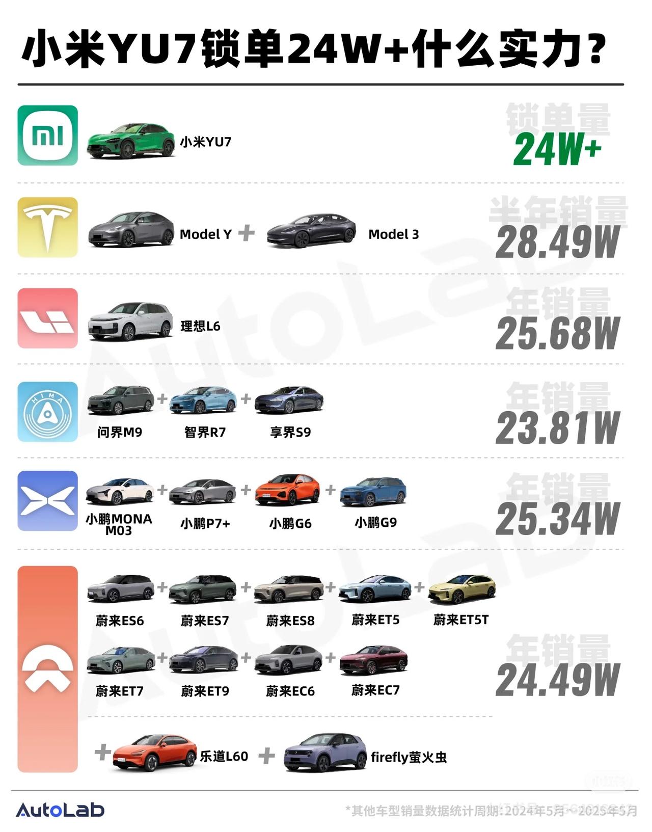 小米YU7锁单24+是什么概念! 刚刚看了一下autolab 发的锁单对比实际销量,小米YU7的锁单已经超过了其他品牌的多车销量总和 当然这个对比存在不确定性 毕竟谁也不清楚锁单是不是真实数据,其次就是即便锁单了后面还会有用户退单的情况,但是小米汽车的锁单确实强的可怕 去年的小米SU7的真实订单其实已经超过了锁单的数据,不得不认同雷军的影响力