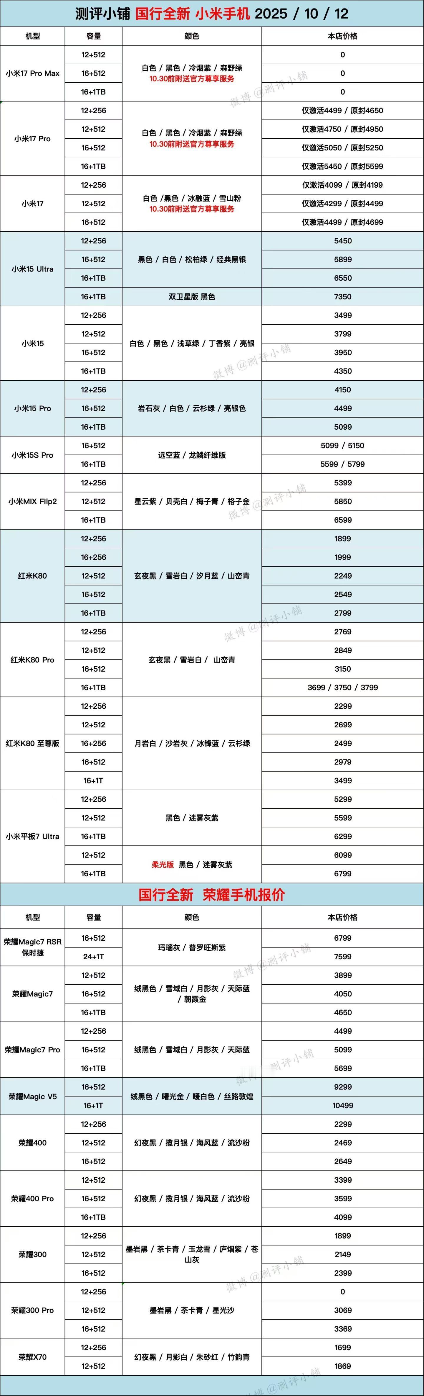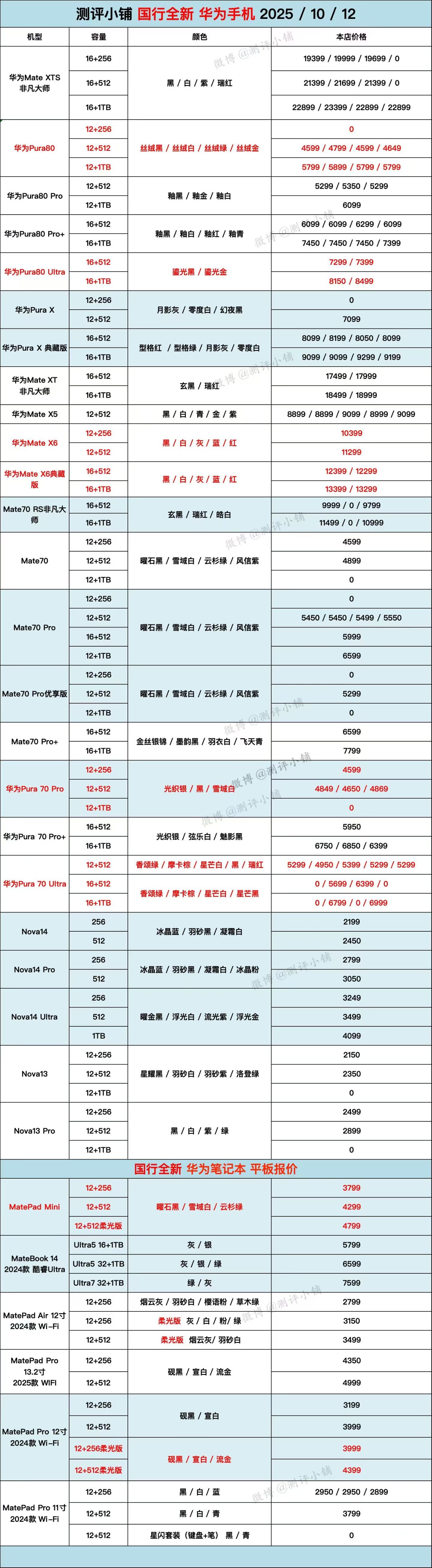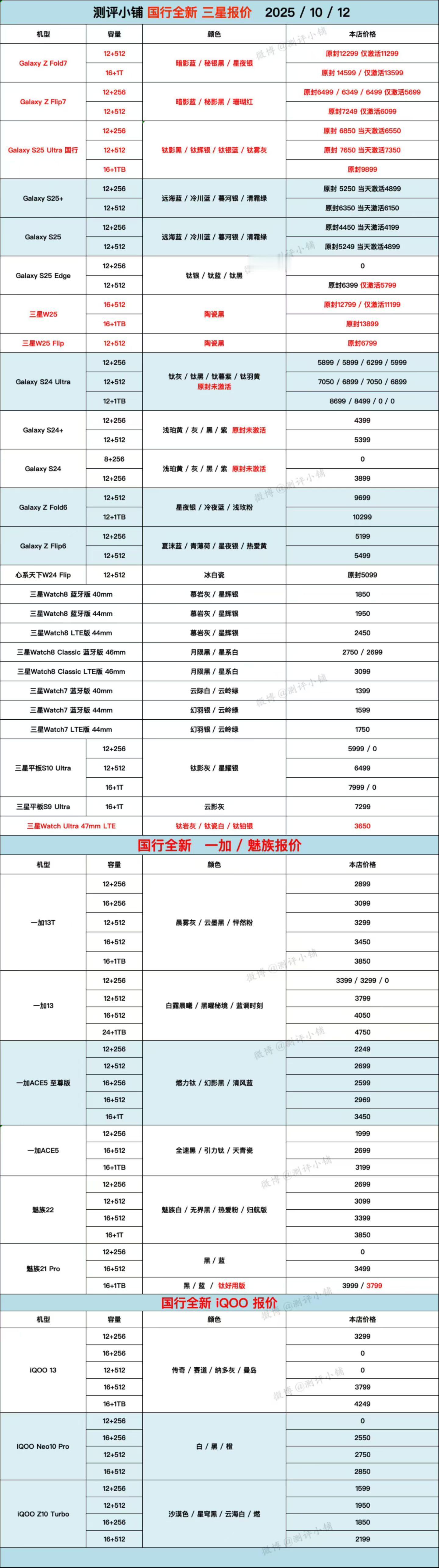 10-12全新机,iPhone全系列,华为Mate XTs,小米17系列,一加13全系列,三星W25,Z Fold6,S25全系列等更新。