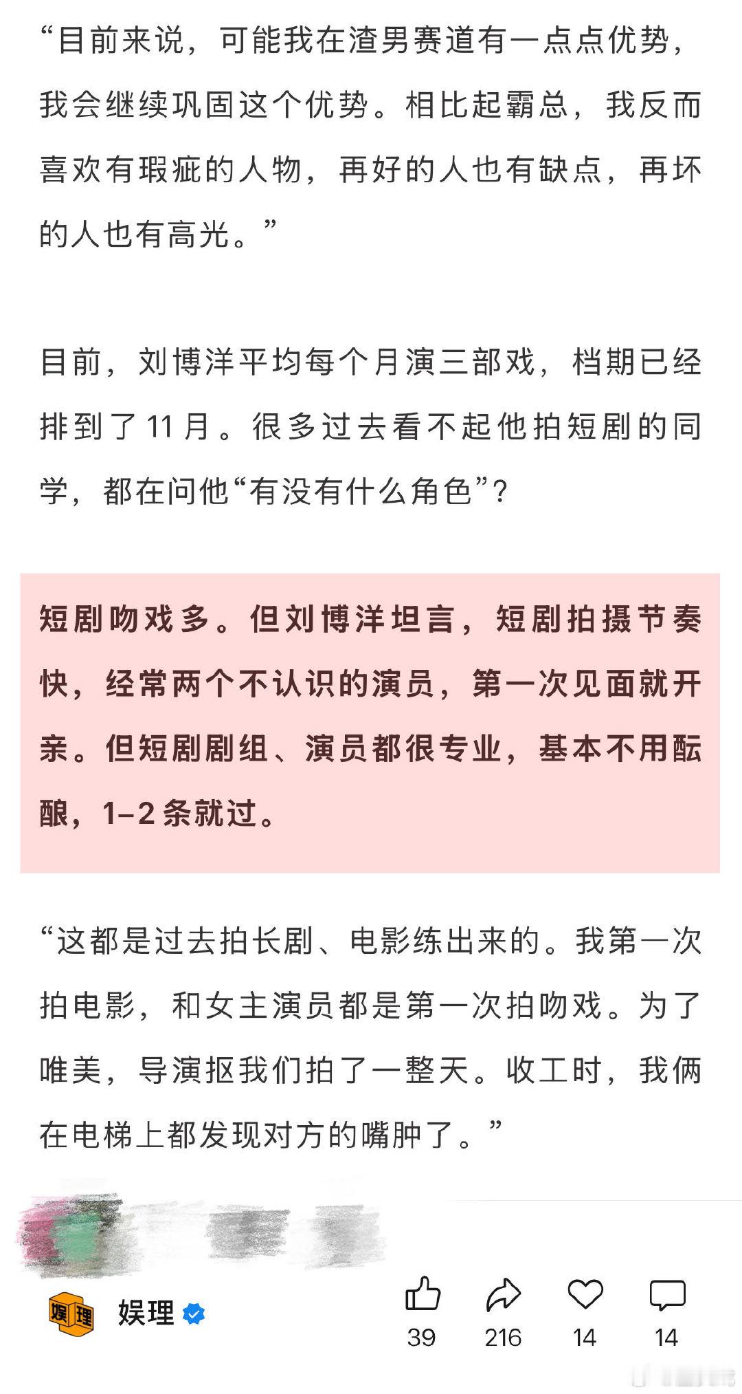 业内称短剧演员演长剧的意愿不高 短剧男演员想和刘萧旭合作 在刘博洋看来,短剧拍摄节奏快,经常是两个不认识的演员,第一次见面就开亲。但短剧剧组、演员都很专业,基本不用酝酿,1-2条就过。“我第一次拍电影,和女主演员都是第一次拍吻戏。为了唯美,导演抠我们拍了一整天。收工时,我俩在电梯上都发现对方的嘴肿了。”娱理独家↓