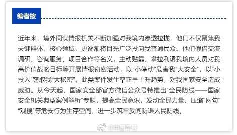国家安全机关根据小杰提供的准确线索,迅速开展调查,成功锁定了以“小椰”为伪装的境外间谍情报机关人员及背后组织,查明了这位“美女博主”以相同的套路诱导、策反我境内100余名人员实施危害国家安全的行为,有效掌握了境外间谍情报机关网勾我边境沿线干部群众,伺机开展策反渗透及情报窃密活动的最新特点。详情↓↓(国家安全部)