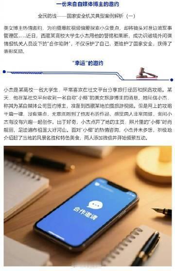 【“不对劲”!大学生识破美女间谍陷阱并举报】所谓美女博主诱导策反我境内100余人 美女博主热情邀约,为拍摄爆款视频偏爱探索小众景点,却将镜头对准边境军事管理区……近日,西藏某高校大学生小杰用他的警惕和果断,成功识破境外间谍情报机关人员设下的“合作陷阱”,不仅保护了自己,更维护了国家安全,获得了表彰奖励。