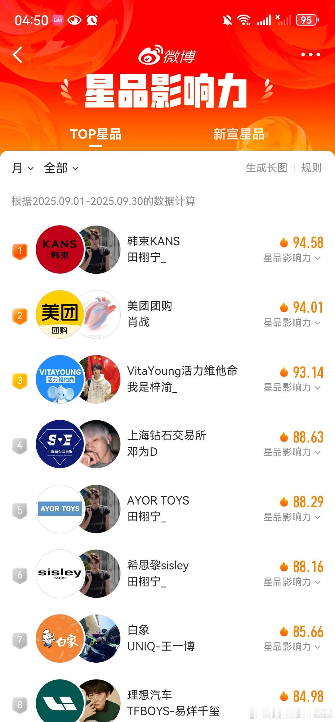 田栩宁八月宣了一个代言,九月宣了三个,十月一个,八月九月还连续霸榜商务星品榜一,