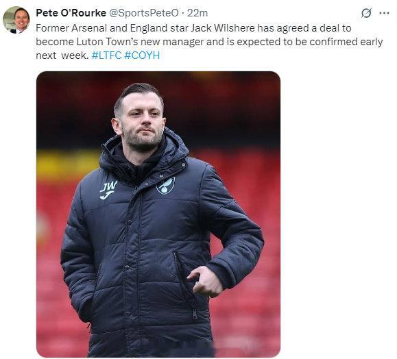 记者PeteO'Rourke透露,威尔希尔已同意担任卢顿的新任主教练,预计此消