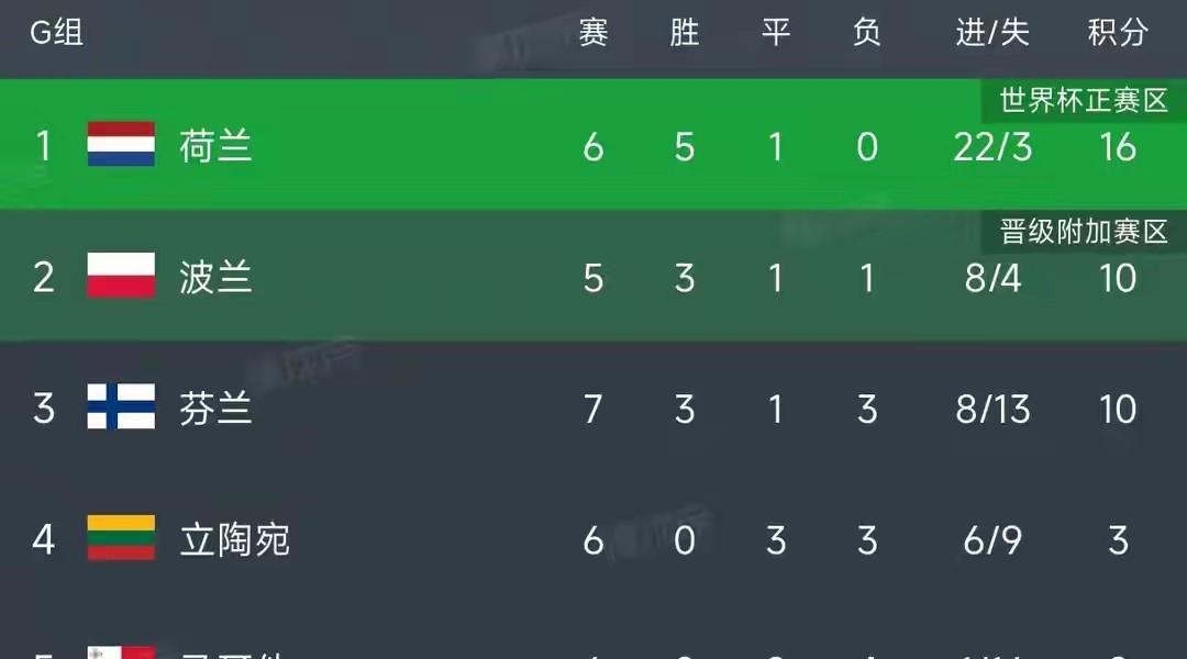 荷兰4:0芬兰,德佩1射2助攻,加克波世界波破门,范戴克头球抢点打入一球,荷兰在拿下芬兰之后基本锁定世界杯资格,波兰和荷兰之间的净胜球差距太大,即使全胜也很难抹平净胜球差距,所以说荷兰基本已经晋级,本次世预赛荷兰确实火力全开,攻击力十足![作揖][作揖]