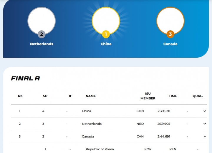 赛后裁判宣布,第二冲线的韩国队犯规,最终荷兰队获得银牌,加拿大摘得铜牌。