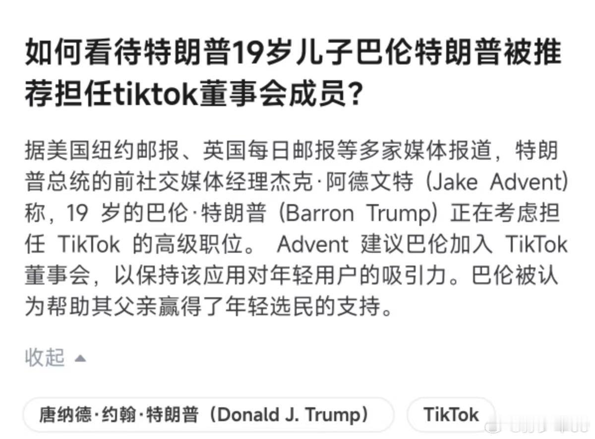 特朗普总统的前社交媒体经理杰克·阿德文特(Jake Advent)称,19 岁的巴伦·特朗普(Barron Trump)正在考虑担任 TikTok 的高级职位。