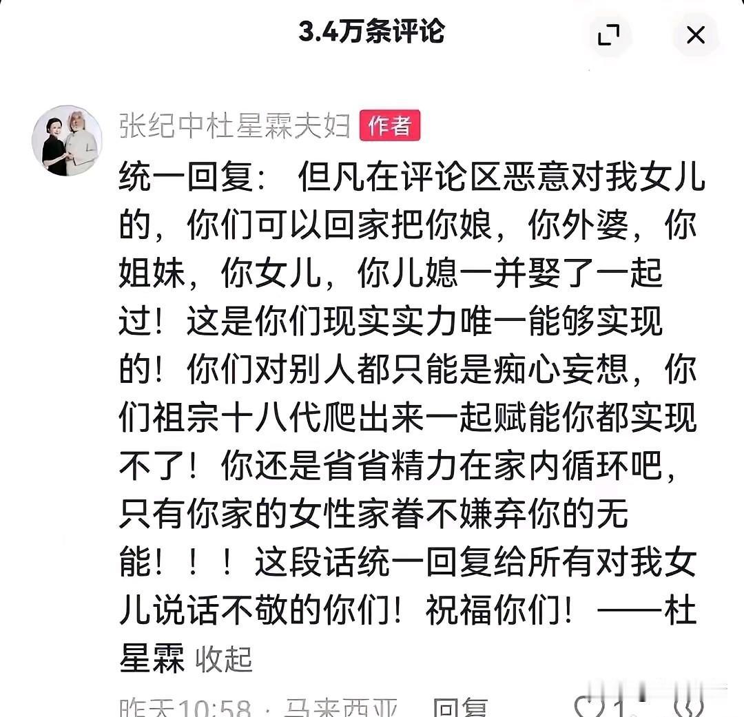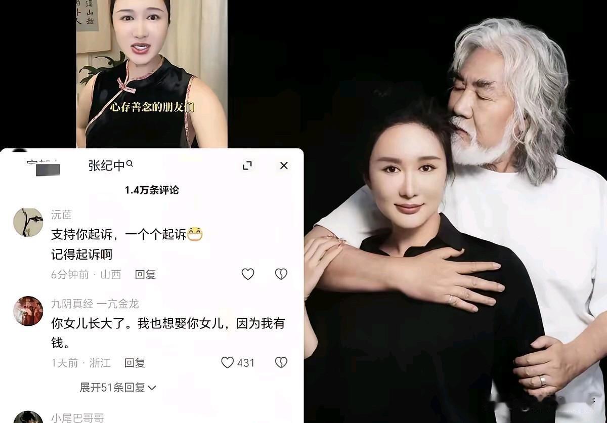 杜星霖回应张纪中给一岁女儿庆生骂战,称自己已经录屏收集好证据, 要起诉那些网络黑粉, 义正言辞表示那些喷我和张导的黑粉, 来一个我骂一个, 这就暴露了账号实际运营者是她本人, 那些粗俗的言语就出自她本人, 要是张纪中本人回复的可能不会这么恶毒,况且毕竟是大导演文笔肯定比这文雅,比网友是不带脏字的, 只是表达了自己的想法, 毕竟张纪中都做了, 其他人也想有样学样, 几万条评论砸过去, 杜星霖估计要回复到手麻了, 实在不行就关闭评论区吧! 本身你的这种婚姻就不是什么光彩的事情,还非要出来炫耀, 无非是想蹭张纪中流量红了继续带货直播赚钱,人家张导又不缺你那仨瓜俩枣的,真要起诉起来也挺费事的, 毕竟你的话语才是重点! 还统一回复,你是手累了吧! 作为公众人物的第三任妻子, 既然选择了金钱就不要玻璃心了! 大家对于张纪中妻子杜星霖表示要起诉网友怎么看? 娱乐圈那点儿事 张纪中 杜星霖 杜星霖情史 张纪中女儿