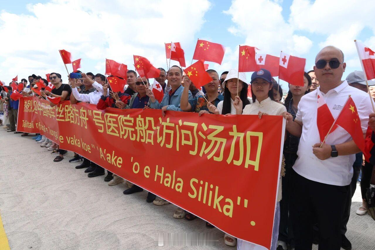 当地时间上午10时,在汤加海军巡逻艇引导下,“丝路方舟”号医院船悬挂中汤两国国旗,缓缓驶抵努库阿洛法港的武纳码头。汤方在码头举行了隆重的欢迎仪式,汤加代理首相及军政要员、中国驻汤加大使和当地民众、华侨华人及中资机构代表等在码头迎接。汤加军乐队演奏中汤两国国歌,身着传统服饰的当地民众向中国海军官兵献上花环,表演民族舞蹈。