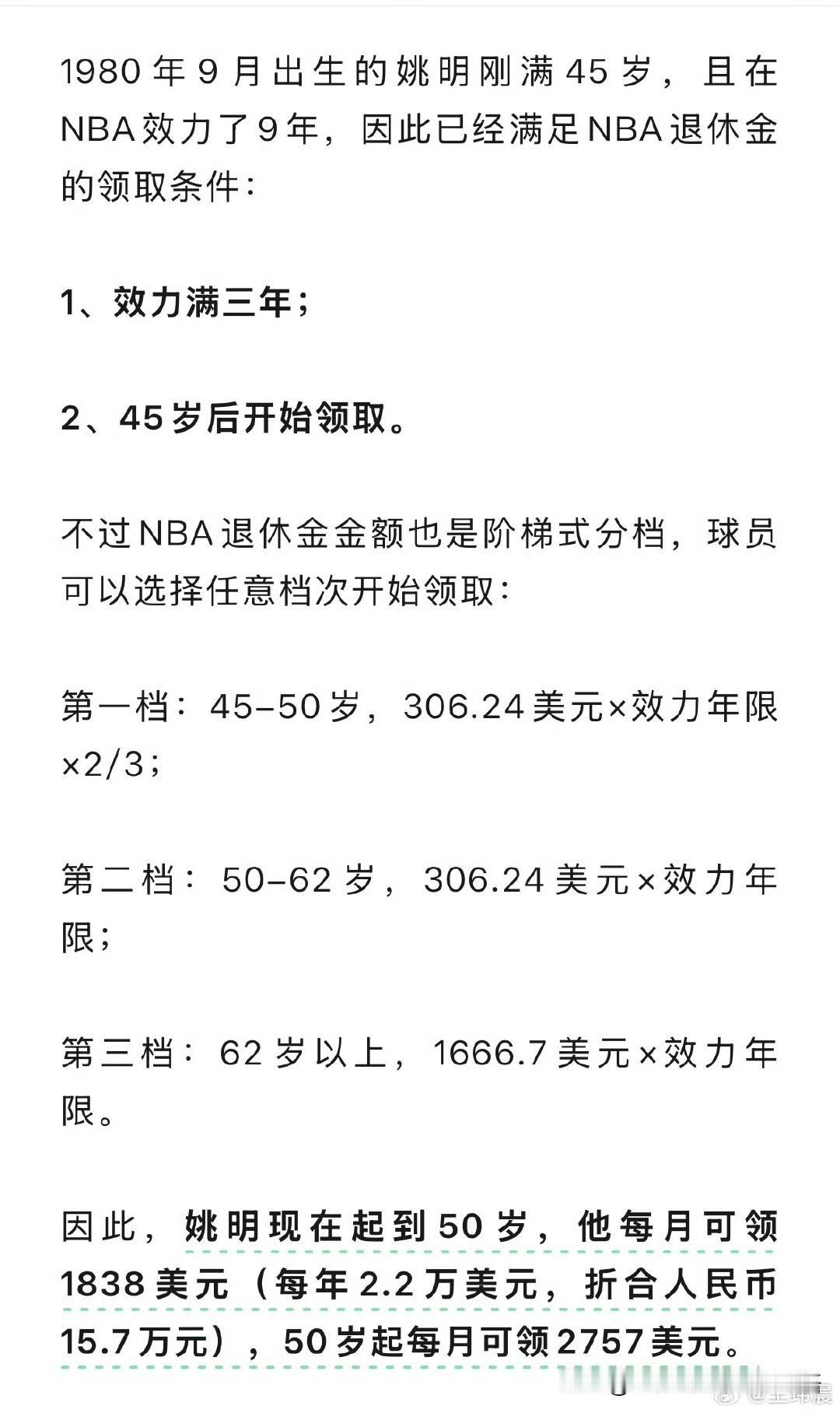 45岁的姚明,都开始领养老金了,每个月1838美元!五年后,每个月2757美金! 原来,已经在nba效力了九年的姚明,已经可以达到了领养老金的年龄和条件了。 不少网友都说:羡慕姚老板啊,年纪轻轻就可以领养老金了。 其实对姚明而言,每月1838美元的养老金仅占其职业生涯总收入(约 9339 万美元)的0.2%,经济意义微乎其微。 但是我们或许也不应把这消息简单解读为 “富豪的锦上添花”,而应该想想我们国家的运动员的一些保障吧。