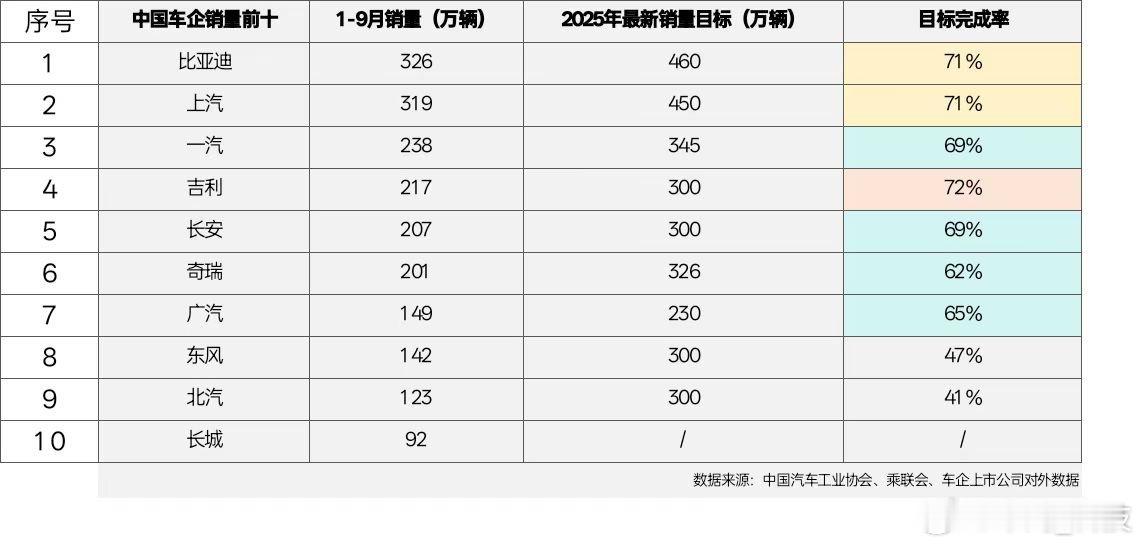 头部阵营中,比亚迪与上汽集团表现突出,1-9月销量均超300万辆,目标完成率均达71%,前者以326万辆巩固领先,后者凭借燃油与新能源双线并行保持稳健。第二梯队里,吉利汽车以217万辆销量实现72%的完成率,位列前十车企完成率首位;一汽、长安销量超200万辆,完成率69%,多品牌协同发展及新能源技术持续的落地带动,有效的保障了规模增长势头。