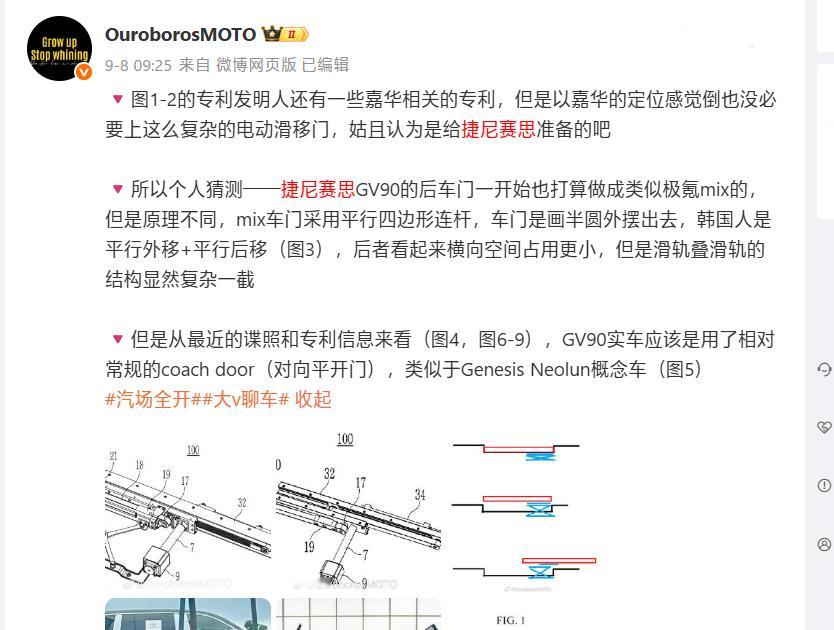 🔻已知的非mpv滑移门的结构要么是极氪mix的平行四边形外摆,要么是捷尼赛思那个离谱的平行叠加滑轨专利,还有世纪suv那种曲臂外摆门,不过图片上只看到主驾侧翼子板没有滑轨,没准丰田开脑洞给副驾侧装了滑轨呢?国内还有几家也有实现类似效果的专利,就不单独贴图了