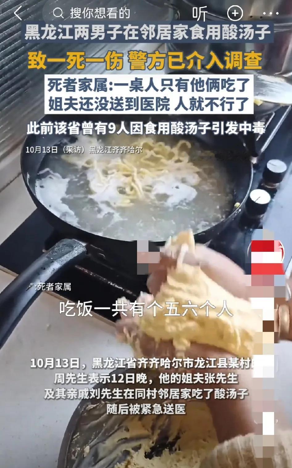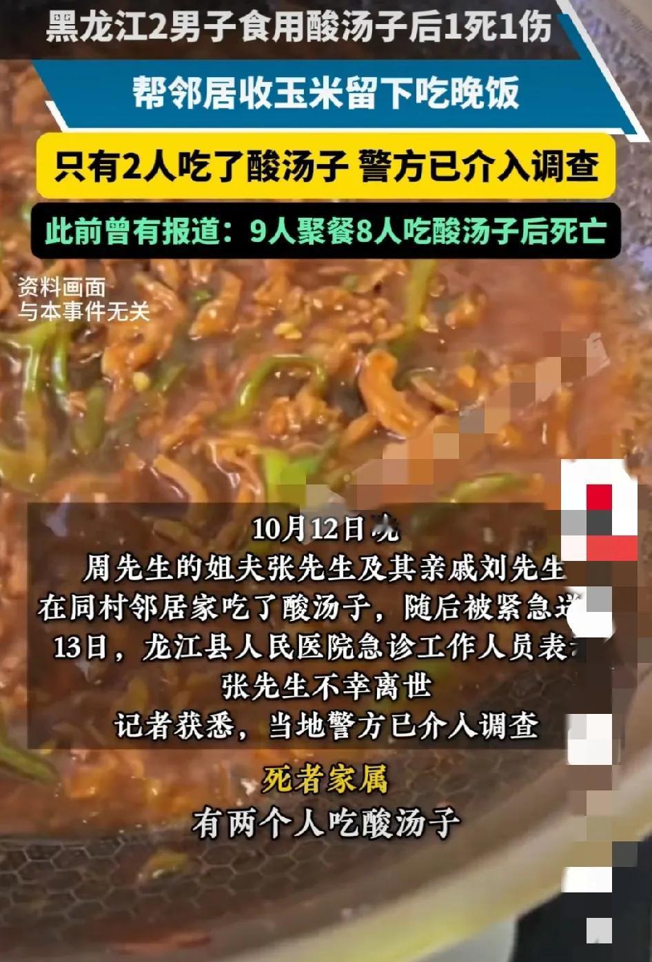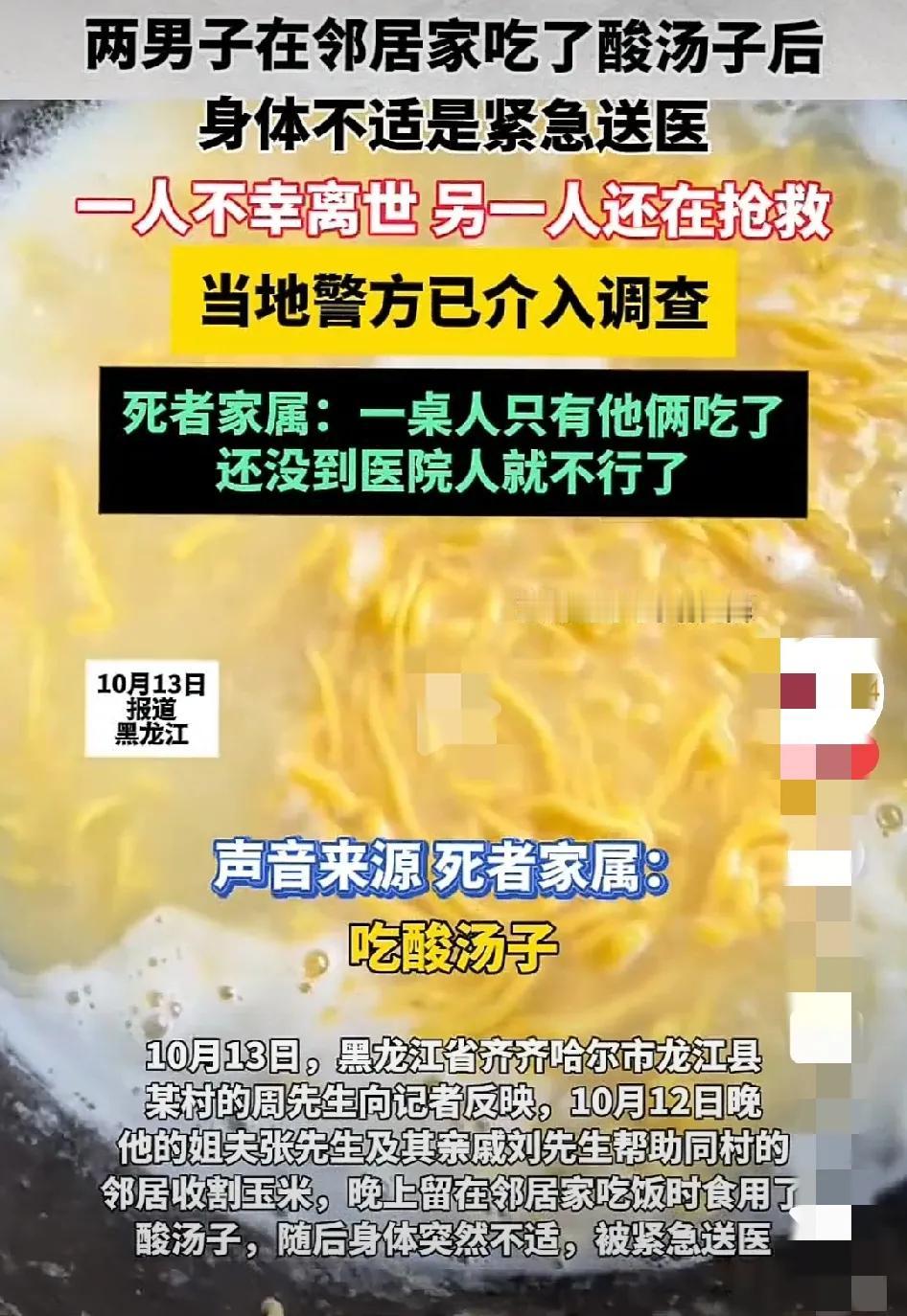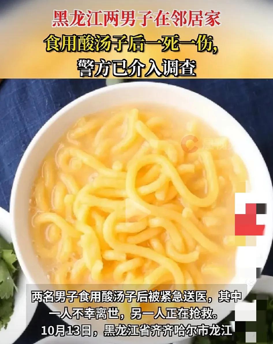 喝个汤,食物中毒,一死一伤!真令人震惊啊!食品安全问题真的太重要了!并且,谁也不知道明天和意外哪个先来!所以说朋友们要注意饮食安全! 据报道,2025年10月12日晚,黑龙江省齐齐哈尔市龙江县某村发生一起食物中毒事件。两名男子在邻居家食用酸汤子后,一人当场死亡,另一人正在抢救中。据家属描述,当晚共有六七人用餐,仅该两名男子食用了酸汤子,其他人均未食用。 再有,酸汤子为东北地区特色发酵食品,用玉米面经长时间发酵制成。2020年黑龙江省鸡西市曾发生类似中毒事件,9人死亡,经检测为椰毒假单胞菌污染导致。该菌产生的米酵菌酸毒素高温无法破坏,中毒后无特效救治药物,病死率超50%。 另外,国家卫健委多次提示:夏秋季制作发酵米面食品(如酸汤子、河粉等)易受椰毒假单胞菌污染,食用后可能引发中毒。