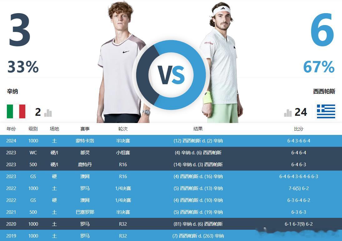第一场就是辛纳vs西西帕斯,虽然对战记录辛纳3:6落后,但西西帕斯目前的状态估计很难再胜;