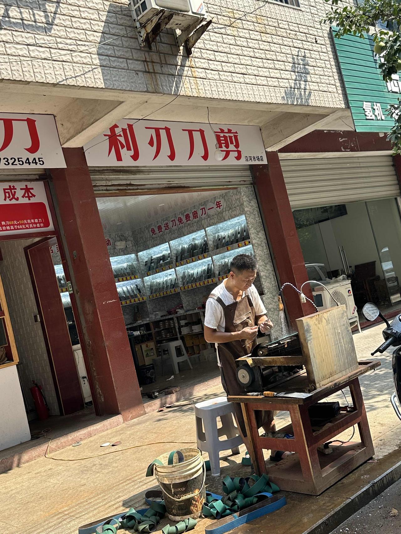 家里的菜刀用钝了、刀柄腐烂脱落了怎么办? “修菜刀诶,磨剪子,”巷子里每当响起这高亢悠长的叫卖声时,我就会想起自己曾经被这具有诱惑力的声音吸引而吃的一次亏: 前些年,一个外地来走江湖的人总是吆喝着“修菜刀诶磨剪子——”在我们小区的小巷里穿行,声音高亢悠长,我就在心里想,这人声音这么好听,是从黄土高坡上来的吗? 于是,当他在我们小区门口停下时,我就拿了一把菜刀跑下楼照顾他生意,他很麻利地帮我磨了菜刀,磨好后,一问价格,他说“ ¥15磨一把菜刀!”当时我就觉得磨刀的价格很贵,但事先没有先讲价格,磨好了刀只好乖乖地交钱。本来打算还要再磨一把菜刀的也就不磨了。 令人惊悚的是,磨好菜刀一手交钱一手交货后,那个人竟然厚着脸皮说“你家里有没有小孩不穿了的鞋子,送两双给我穿一下?我可以跟你上楼去取。”我一听,还想进我家门?什么居心?有点被吓到了,居然还有这样的人!当即回答他:“没有!”转身上楼!从此以后再也不敢轻易相信这样走街串巷的老江湖了! 前些天去农贸市场买菜,不经意地看到沿河路新开了一家磨菜刀的店,很好奇,就进店里问了一下,店老板说,磨一把菜刀五元钱,我再问他菜刀的木头刀柄腐烂脱落了是否可以修理?他说可以,也是五元钱一把。这么便宜!于是兴冲冲地回家取了这把坏了的菜刀来店里打磨和修理。 今天顺路去取菜刀,这菜刀焕然一新,刀片被打磨得亮闪闪的,给安装了一个崭新的木质刀柄,简直认不出是我拿来修理的菜刀了,老板收了我10元钱,价格很便宜,太划算了! 两个磨刀匠,那个走江湖的,与这位开店的相比,简直就是冰火两重天!