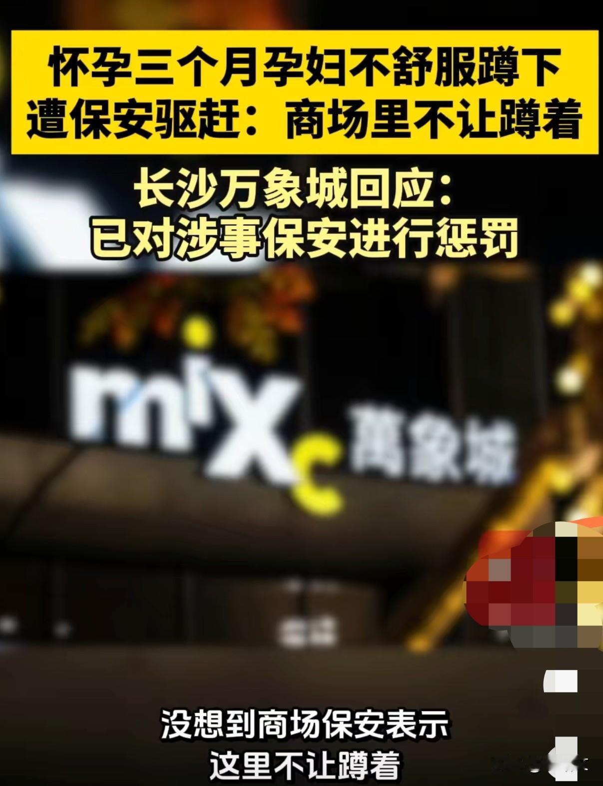 长沙万象城这波操作太膈应!孕妇蹲地缓孕反遭驱赶,规矩比人金贵? 湖南长沙这事儿刚冒头就炸了锅,怀孕仨月的准妈妈蹲商场歇口气,居然被保安硬邦邦赶了走,理由是“不让蹲”,听着都来气。 这网友说得清清楚楚,他媳妇孕反邪乎,一天吐好几回,那天在万象城突然犯恶心,附近没座就临时蹲了下。哪成想保安立马过来了,语气特冲说不让蹲。 换谁受得了啊?孕早期那破难受劲儿,过来人都知道多熬人,吐得胆汁都出来是常事,浑身虚得站不住,蹲会儿都算奢侈。这保安倒好,眼睛跟焊了似的看不见人难受。 关键当时周围压根没别的顾客,既没挡道也没碍着谁,就这么被硬生生撵走,准妈妈心情能好才怪,本来孕期情绪就跟过山车似的,一点破事都能委屈哭。 后来商场倒是出来说话了,说保安疏忽,罚了,还私信道歉想给礼品补偿。可人家顾客压根没接这茬,换我我也不接,这哪是礼品能补回来的膈应。 咱就说这规矩是死的,人得是活的吧?隔壁有家商场下雨都能变通接上课的孩子,咋到这儿对孕妇就这么较真?保安守规矩没错,但得带点脑子啊。 你瞅瞅人家胖东来,遇着有难处的顾客都能拆报警器送温暖,再看这儿,孕妇蹲会儿都容不下,这服务差距可不是一星半点。真当商场是没人情味的水泥壳子? 惩罚保安倒是快,可根子问题解决了吗?要是培训的时候就讲透人性化,别死抠条条框框,哪能出这岔子?这哪是保安的错,分明是管理的漏洞。 准妈妈们怀个孕多不容易,吐得昏天暗地,累得站着都能睡,本就该被多照顾。结果在这儿连蹲地缓劲儿的权利都没有,这商场的温度真是低得离谱。 礼品补偿说白了就是想息事宁人,可顾客要的从来不是这点东西,是被尊重,是遇到难处时能有句暖心话、伸个援手。这点都想不明白,下次还得犯糊涂。 商场是给人逛的,不是给规矩摆谱的地方。真要讲形象,不是靠管着孕妇不许蹲,是靠有人情味的服务,让人觉得舒服、踏实。 希望这事儿能给所有商场敲个警钟,别再把死板规矩当圣旨了。多看看人的难处,多份体谅,比啥都强,毕竟谁家里没个老人孩子、没个需要照顾的时候呢? 人性化这仨字说着简单,得真落实到行动上。别等出了事才罚人道歉,平时把服务做到位,让每个进店的人都能感受到暖意,这才是真本事,你说对不?