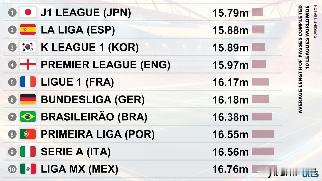 全球各大联赛球队按“传控指数”(平均传球长度)从高到低排序 🥇 J1联赛 🇯🇵 15.79 米 🥈 西甲 🇪🇸 15.88 米 🥉 K联赛1 🇰🇷 15.89 米 ··· 8⃣ 葡超 🇵🇹 16.55 米 9⃣ 意甲 🇮🇹 16.56 米 🔟 墨超 🇲🇽 16.76 米 数据源自 @CIES_Football 联合分析。