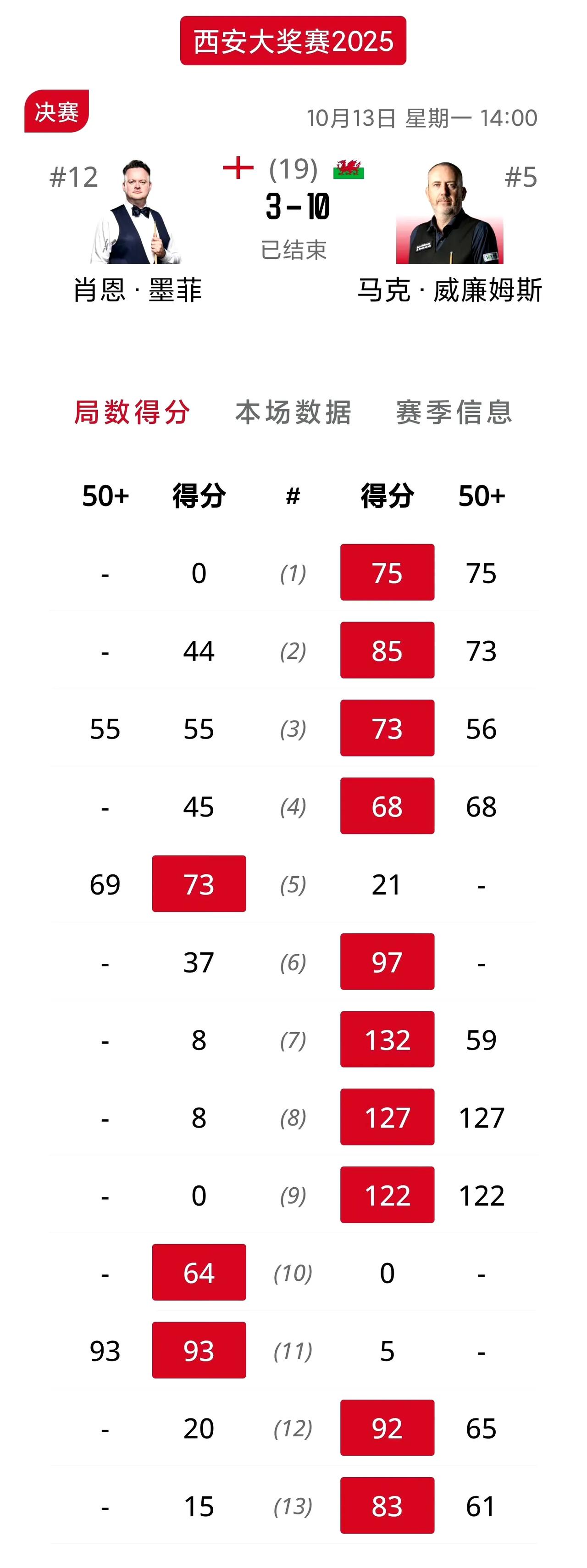 威廉姆斯屠杀墨菲夺冠!这比赛上半场已经决定了比赛结果,老马作为一个50岁206天的高龄,连续超神表现打的墨菲毫无还手之力,目前表现依旧无人能敌,而墨菲则失去准度,状态远不及对阵丁俊晖时的状态,决赛的巅峰对决变成了单方面的屠杀,老马重返巅峰,牛人[赞]