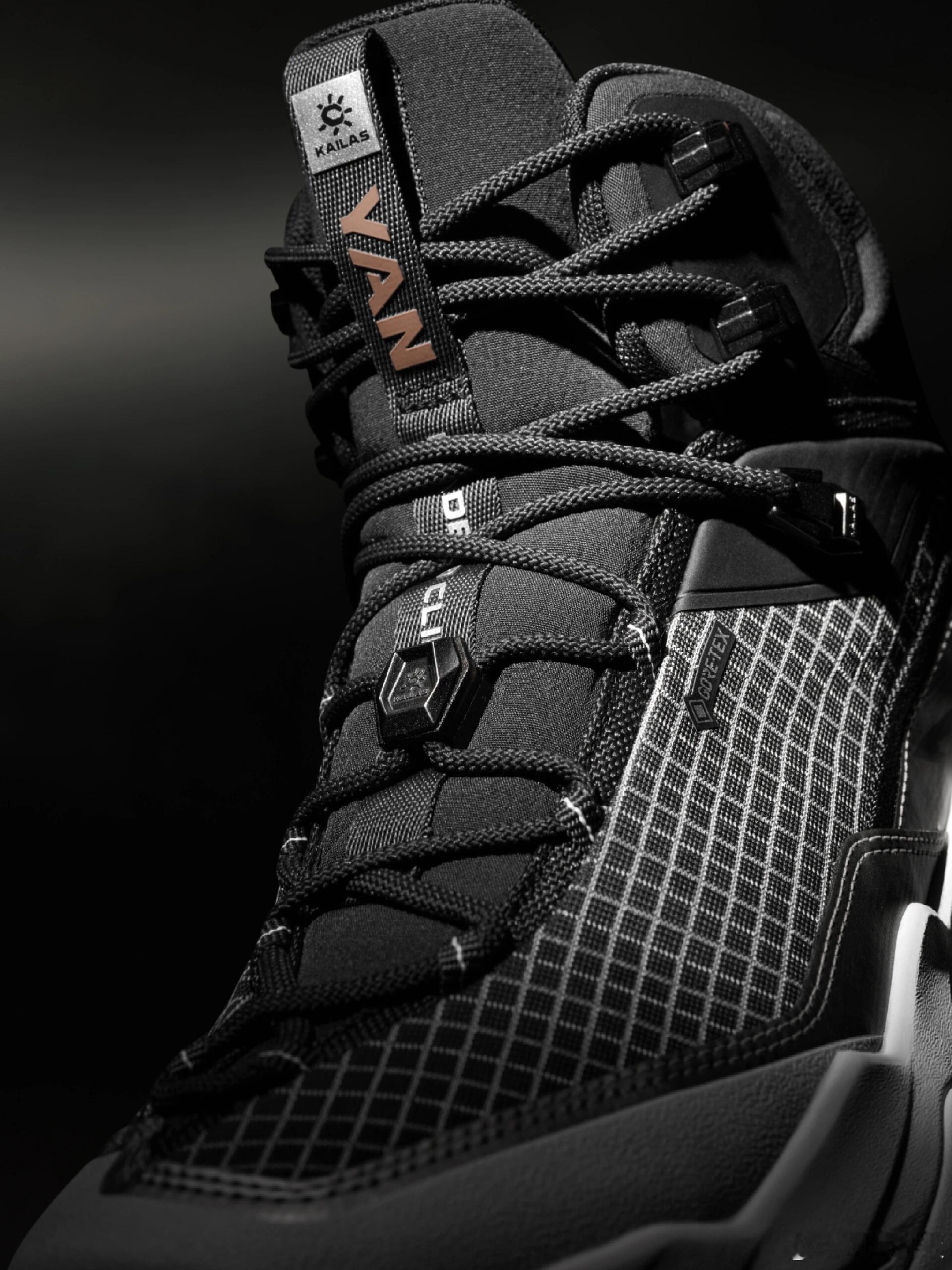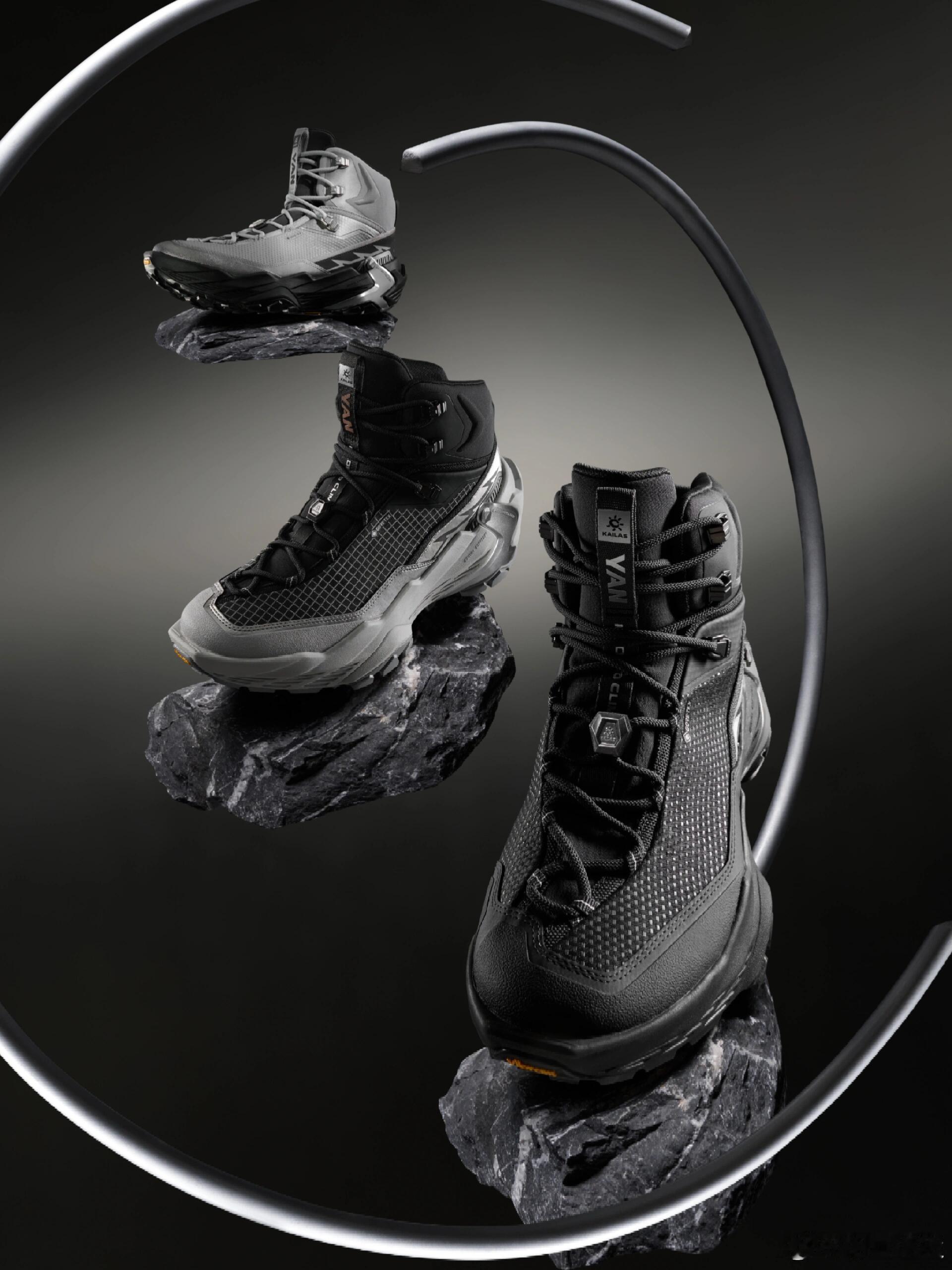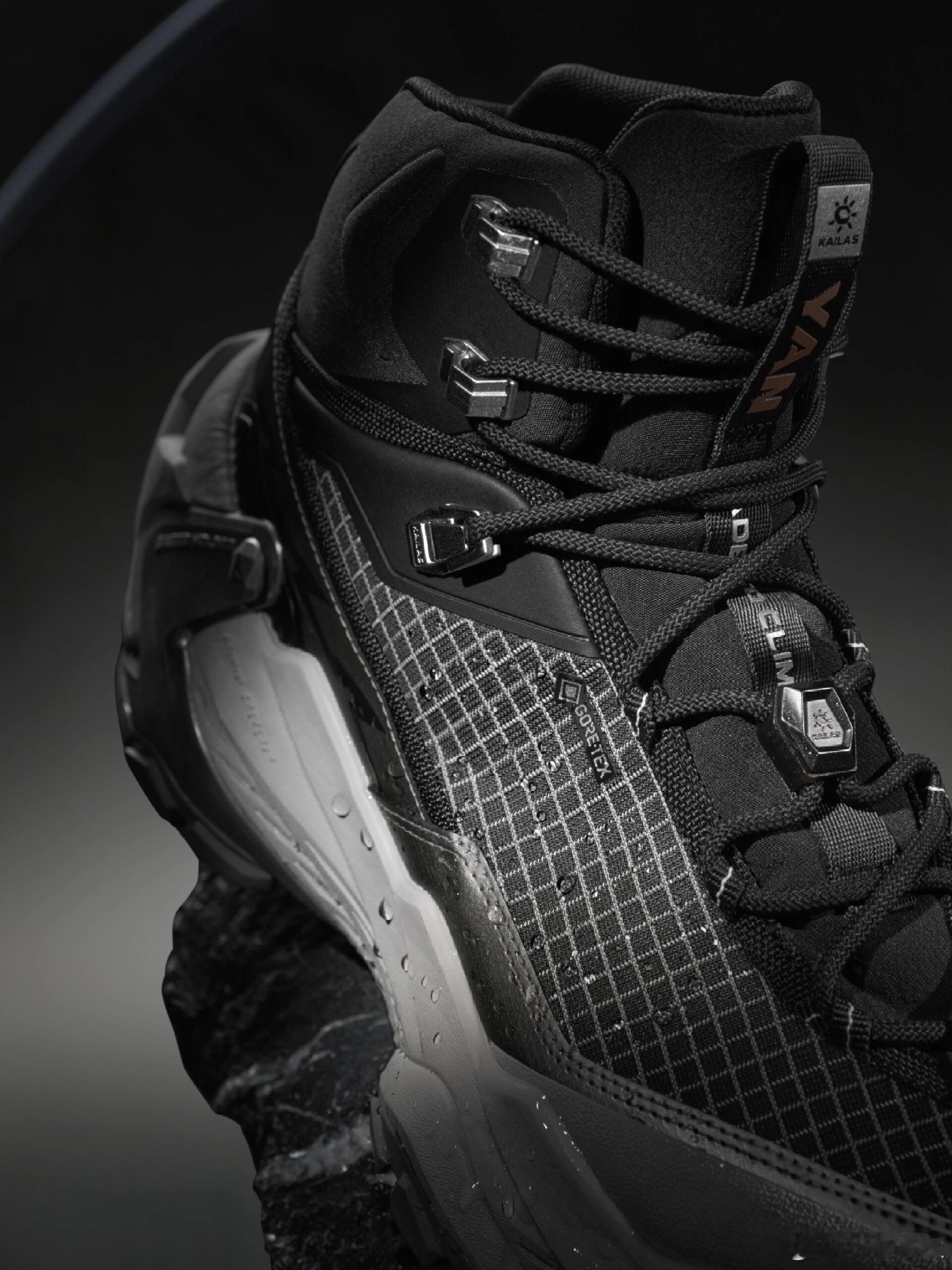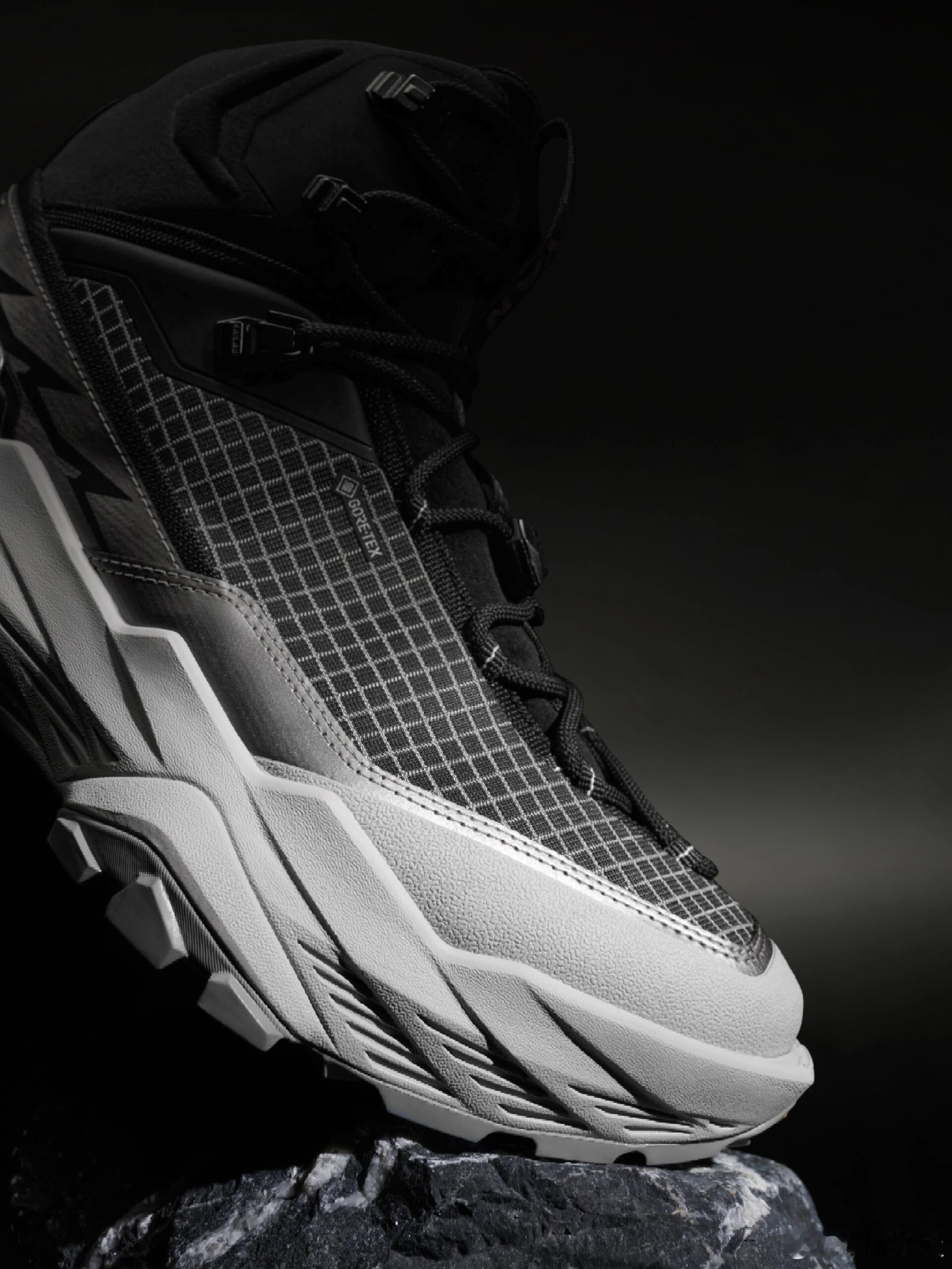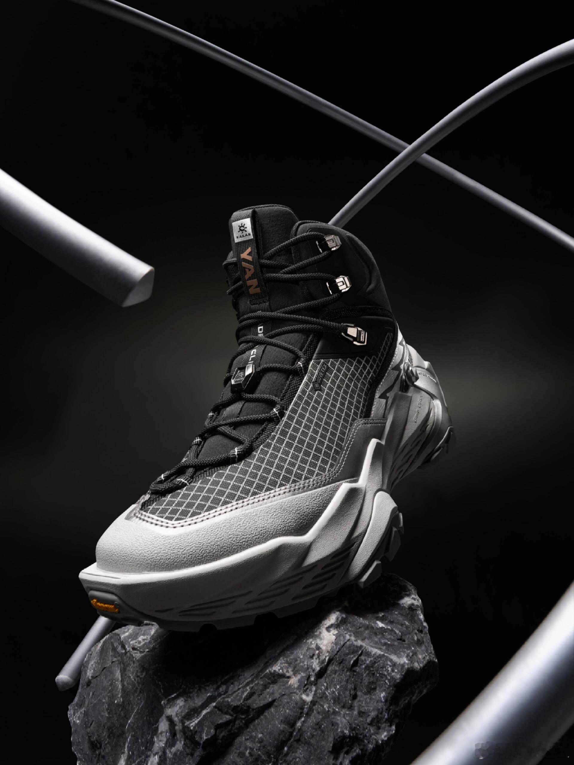 最为亮眼的是其性能表现:厚实且纹路深刻的灰白色大底,赋予它强大的抓地力与耐磨性,足以从容应对复杂崎岖的户外地形。整体黑、银、灰白的配色方案,在暗调背景的衬托下,尽显其硬朗、专业的风格。