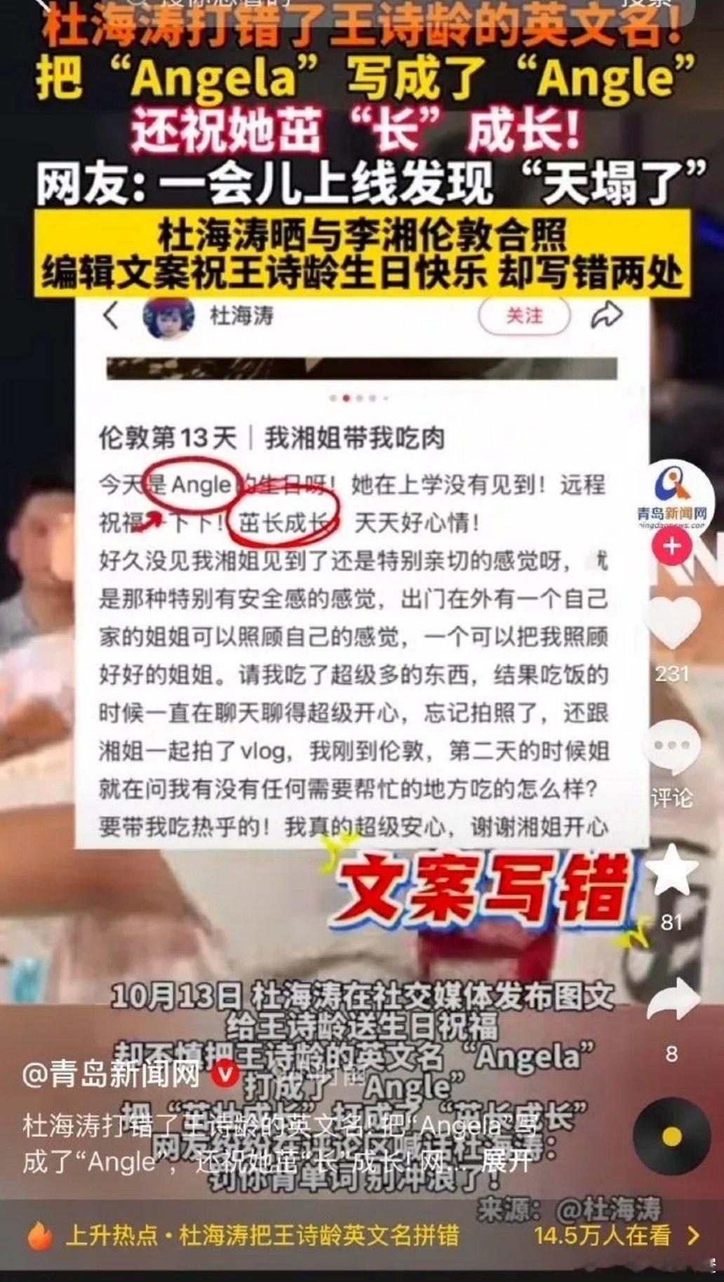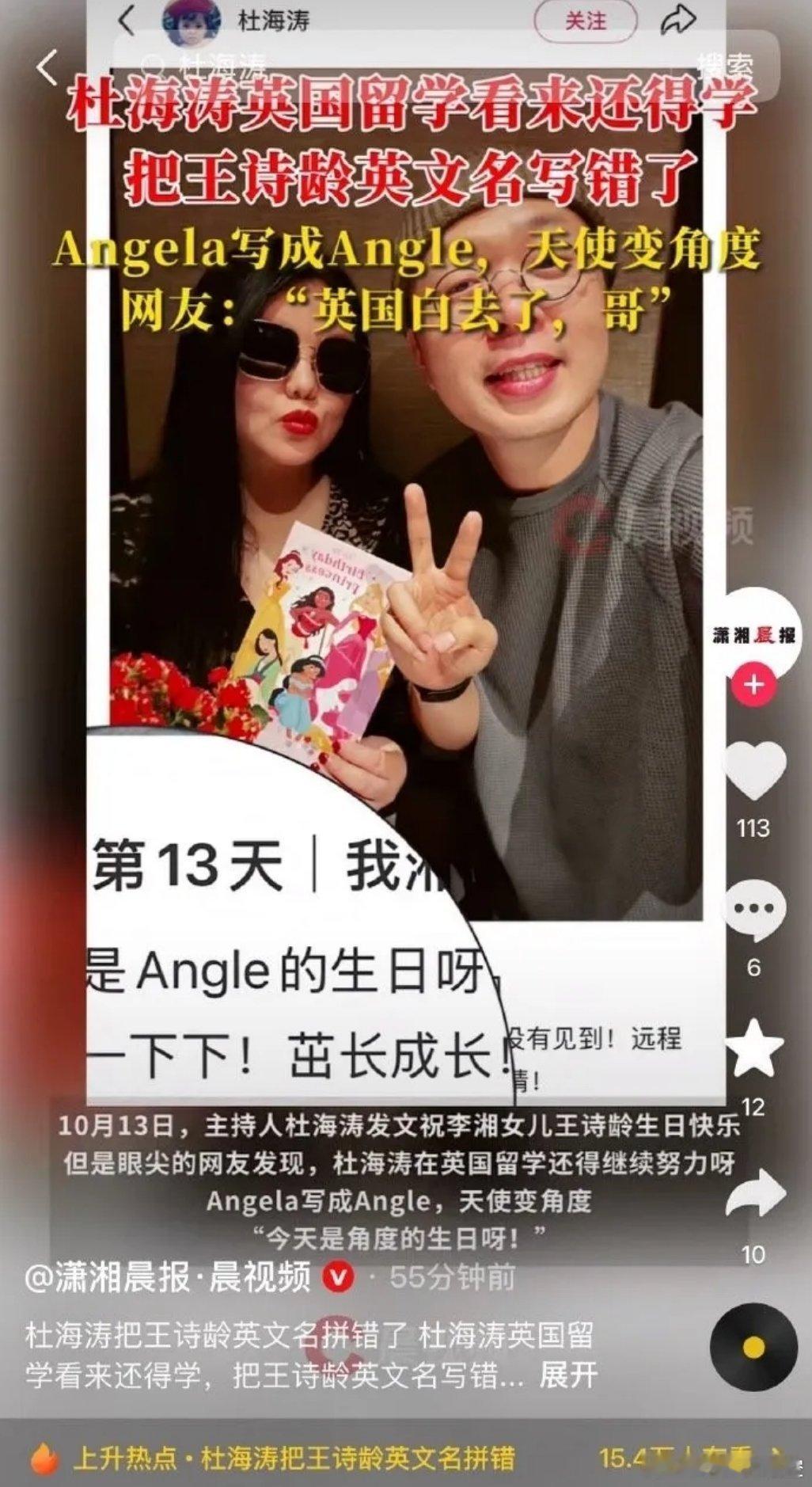 如此被热情招待的杜海涛却把老前辈李湘女儿英文名写错了,Angela写成Angle。