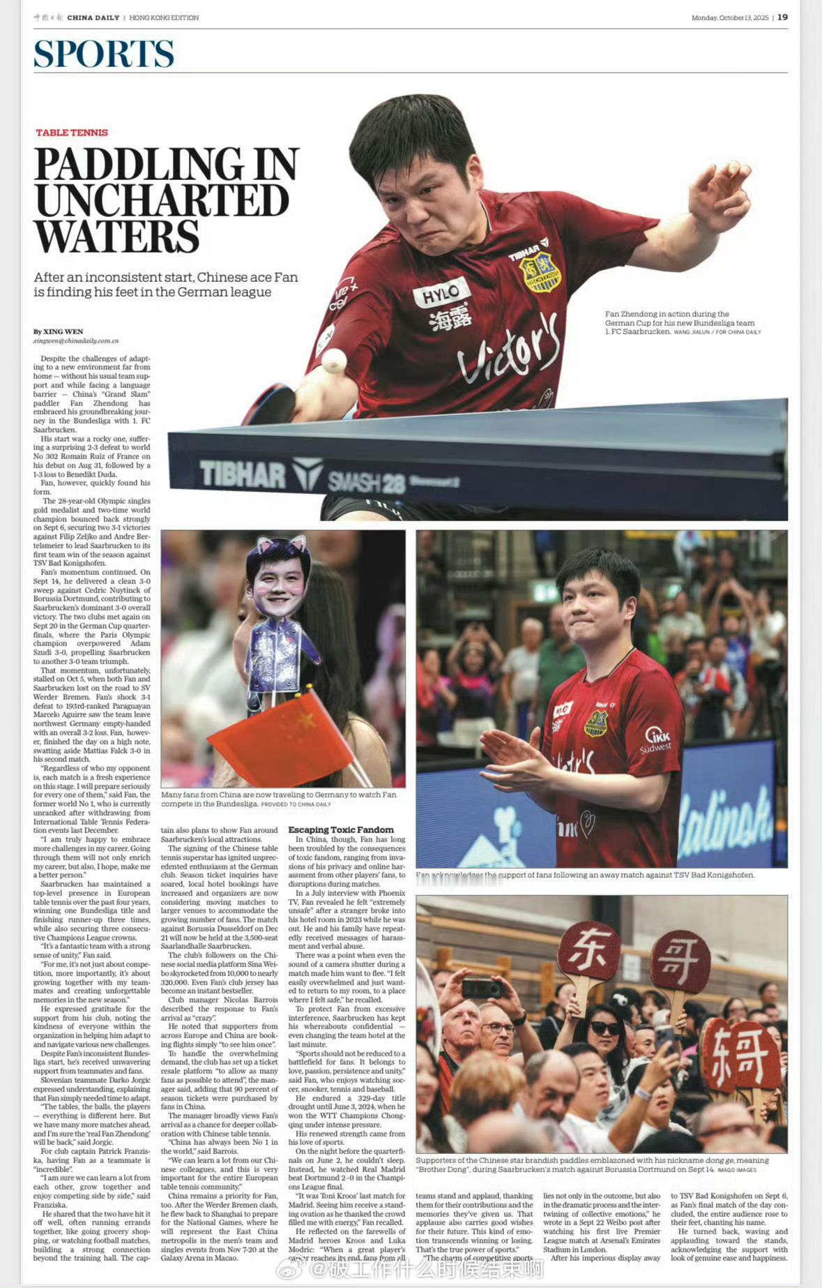 🏓“After an inconsistent start, Chinese ace Fan is finding his feet in the German league”
