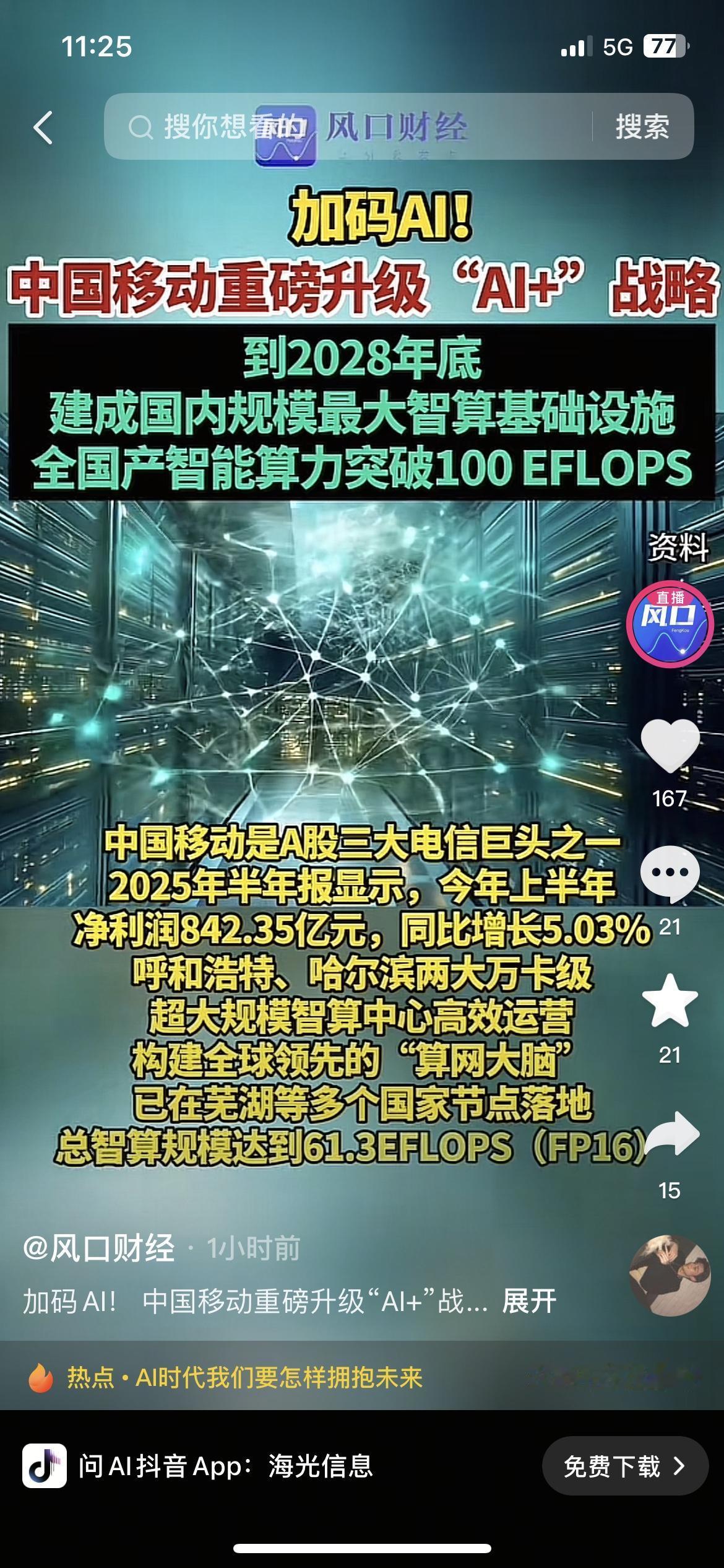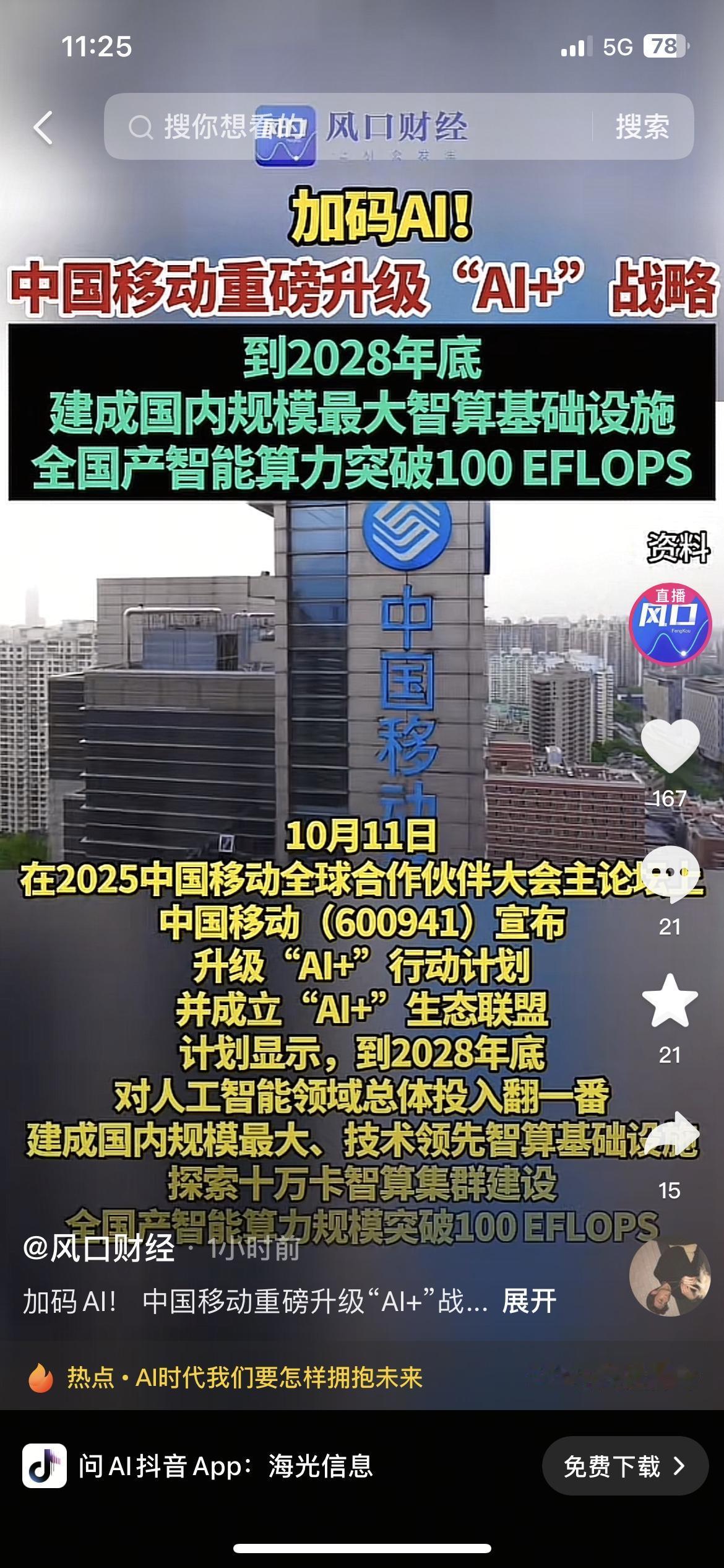 中国移动重磅升级“AI+”战略!2028年国产智能算力剑指100 EFLOPS 家人们,10月11日中国移动宣布升级“AI+”行动计划,还成立了“AI+”生态联盟,咱们来聊聊这事儿对A股的影响。 这次中国移动的计划很有分量,到2028年底要建成国内规模最大的智算基础设施,全国产智能算力突破100 EFLOPS。这属于AI、算力、通信领域的大事件,A股里的AI板块、算力板块、通信板块可能会受市场情绪关注。从产业链关联来看,AI板块涵盖算力基础设施、人工智能应用等环节,对应着相关个股。从市场情绪角度看,这类巨头的战略升级短期或带动板块情绪,但具体走势还要结合行业竞争、技术进展等多方面因素。 你觉得中国移动升级“AI+”战略对A股相关板块影响大吗?来评论区聊聊~ 本文仅为市场信息解读,不构成任何投资建议,据此操作风险自担 A股热点 中国移动AI 算力板块AI算力板块