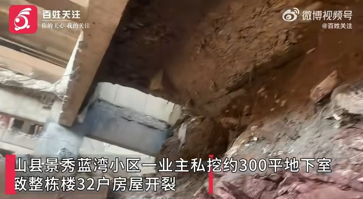 业主私挖300平地下室32户开裂印象中上一次发生这样的事,还是北京老胡同的四合院里有人私挖地下室,导致整个四合院地基下沉、渗水。