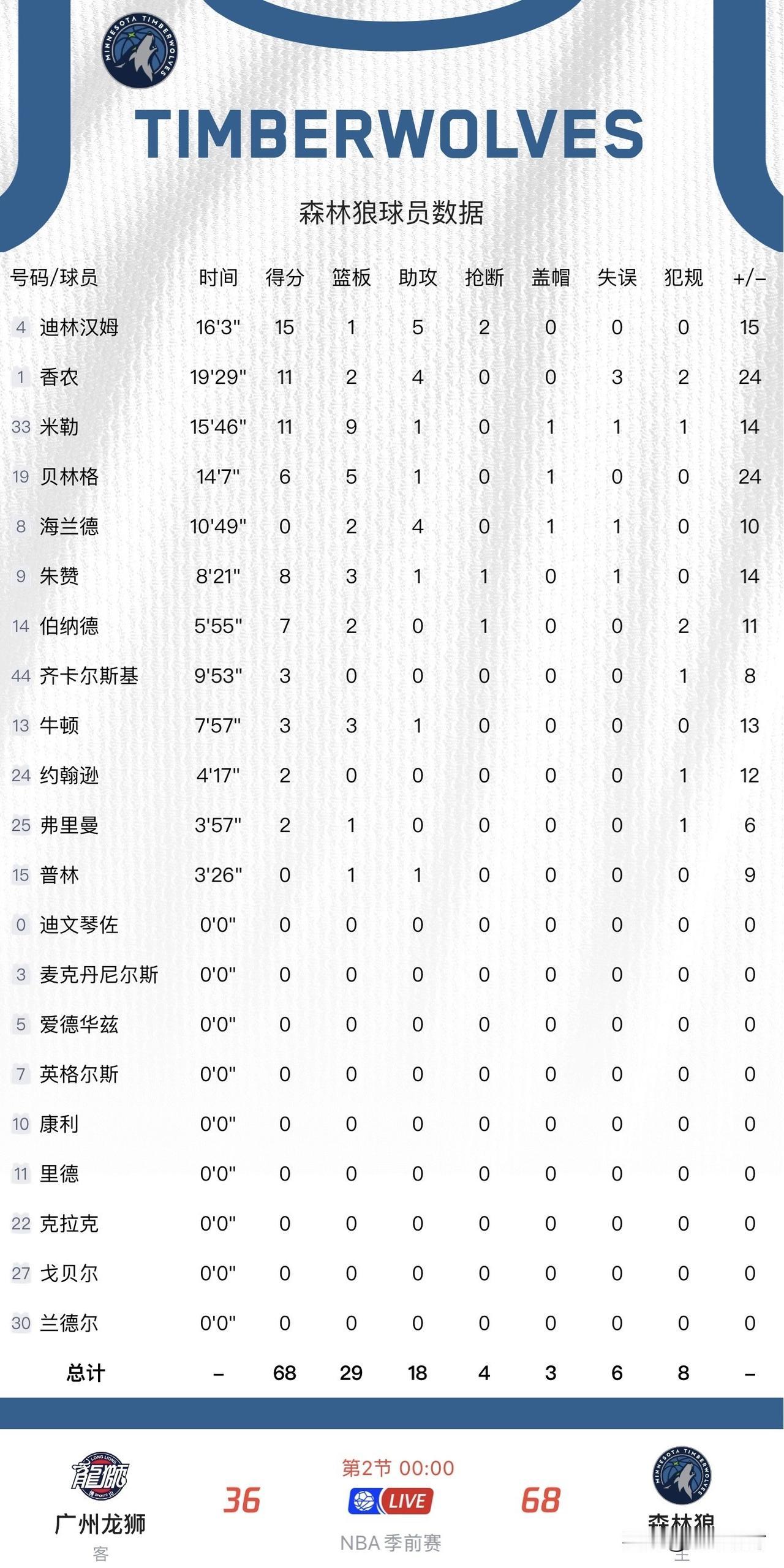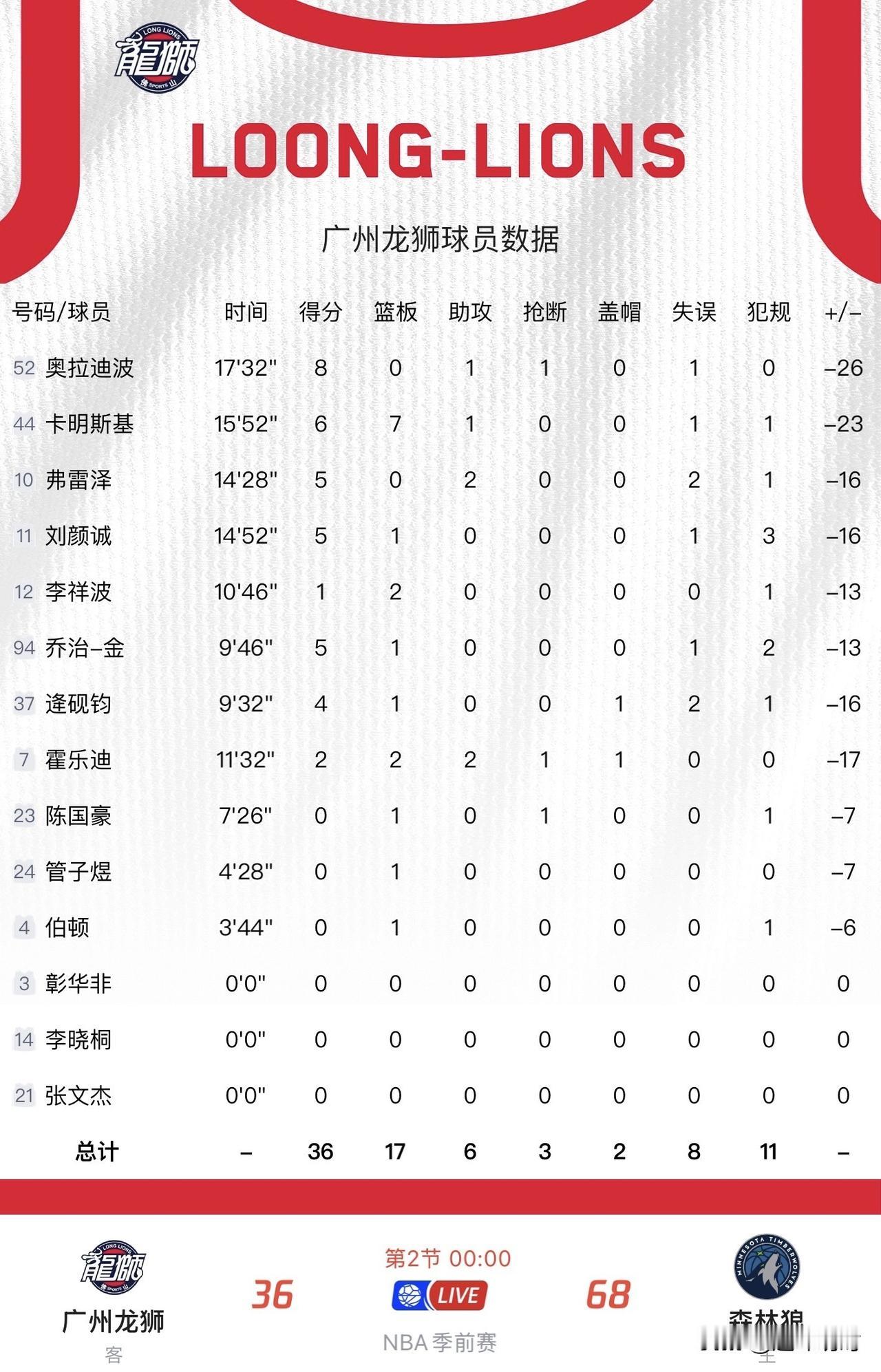 只要稍微发力,CBA与NBA的巨大差距就显现出来了! 在今天广州龙狮对阵森林狼的季前赛中,仅只打了半场比赛,广州龙狮就以36比68大比分落后于森林狼;要知道广州龙狮以全主力阵容加四外援出战,而森林狼仅以第三阵容加双向合同球员出战,二者一打差距就明显出来了。 因为森林狼的这些角色球员可是实打实想靠表现赢得稳定出场时间或者稳定合同,所以打球都比较认真,不太会收着打;而广州龙狮主要靠外援球员苦苦支撑,国内球员在上场对位时明显感到力不从心,当进攻续不上的时候,比分一下子就拉开了。 虽然比分输的有些稍微难看,但广州龙狮的出发点是好的,只有勇敢走出舒适区,跟NBA这些顶尖球员进行同场竞技,才能发现自身的不足,不断提升并慢慢追赶上去,💪